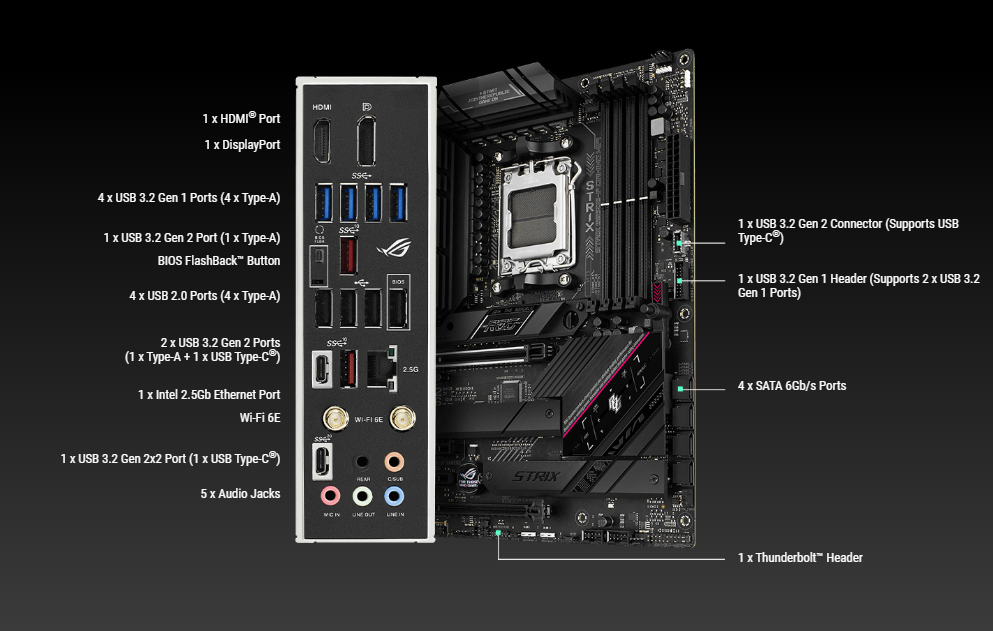 1 x USB 3.2 Gen 2×2 port (1 x USB Type-C®) 3 x USB 3.2 Gen 2 ports (2 x Type-A + 1 x USB Type-C®) 4 x USB 3.2 Gen 1 ports (4 x Type-A) 4 x USB 2.0 ports (4 x Type-A) 1 x DisplayPort 1 x HDMI® port 1 x Wi-Fi Module 1 x Intel® I225-V 2.5Gb Ethernet port 5 x Audio jacks 1 x BIOS FlashBack™ button