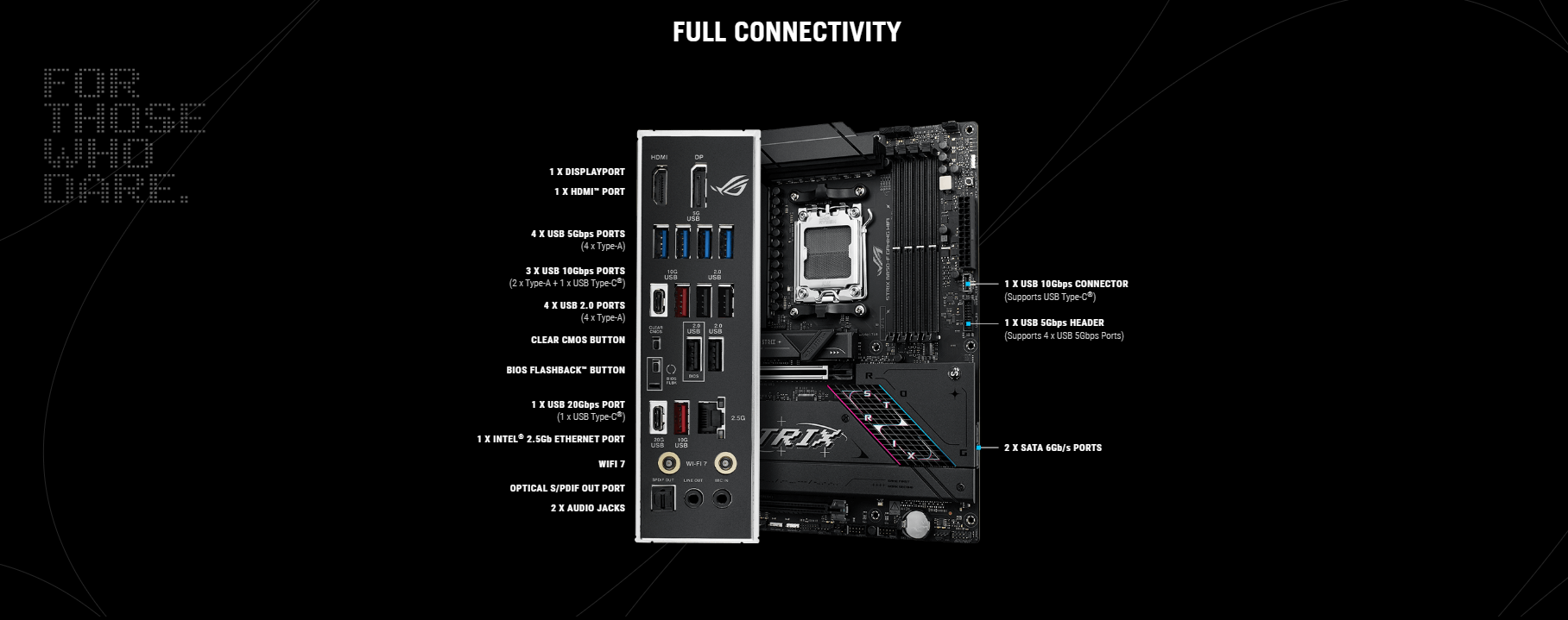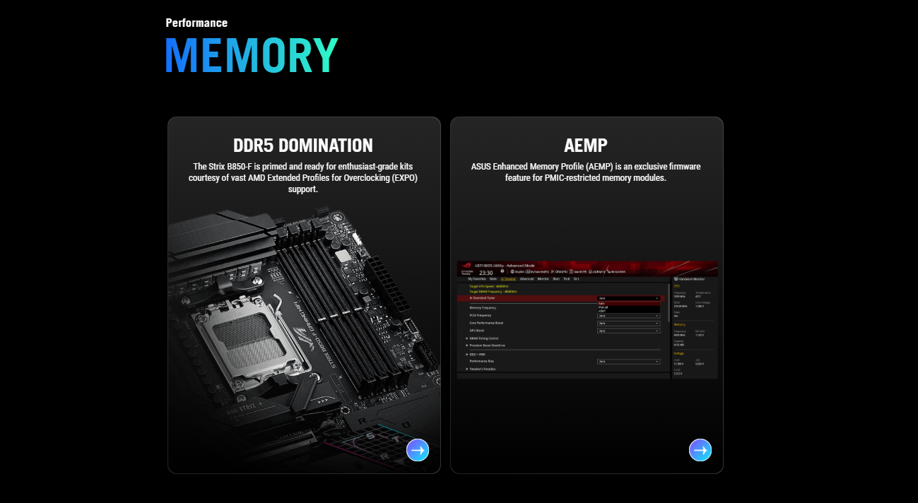 4 x DIMM slots, max. 256GB, DDR5 Supports up to 8000+MT/s (OC) with Ryzen™ 9000 & 8000 & 7000 Series Processors ECC and Non-ECC, Un-buffered DIMM Dual channel memory architecture Supports AMD Extended Profiles for Overclocking (EXPO™) ASUS Enhanced Memory Profile (AEMP) * Supported memory types, data rate (speed), and number of DRAM modules vary depending on the CPU and memory configuration, for more information please refer to CPU/Memory Support list under the Support tab of product information site or visit https://www.asus.com/support/download-center/. ** Non-ECC, un-buffered DDR5 memory supports On-Die ECC function.