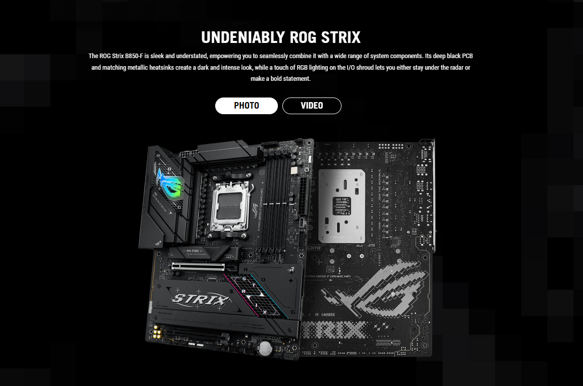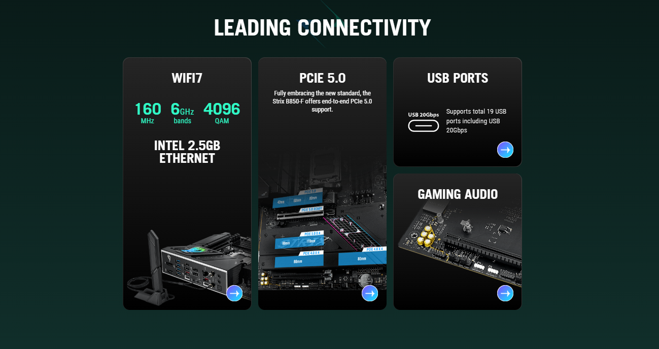 AMD Ryzen™ 9000 & 7000 Series Desktop Processors 1 x PCIe 5.0 x16 slot with Q-Release Slim AMD Ryzen™ 8000 Series Desktop Processors 1 x PCIe 5.0 x16 slot with Q-Rlease Slim (supports PCIe 4.0 x8 or x4 mode)* AMD B850 Chipset 1 x PCIe 4.0 x16 slot (supports x4 mode)** * Specifications vary by CPU types. ** PCIEX16(G4) slot (supports x4 mode) from AMD B850 Chipset shares bandwidth with M.2_3 – To ensure compatibility of the device installed, please refer to https://www.asus.com/support/download-center/ for the list of supported peripherals.
