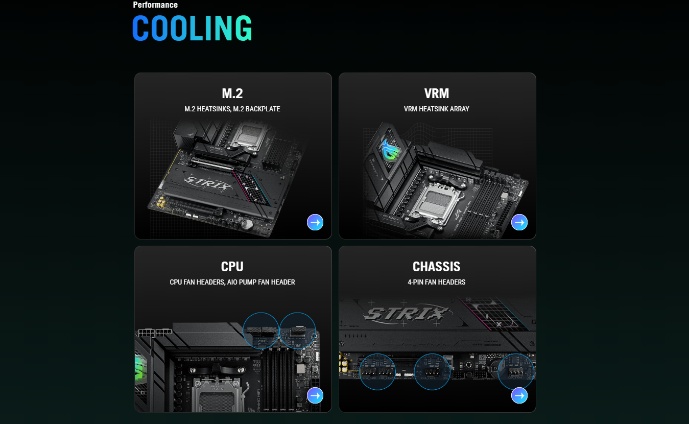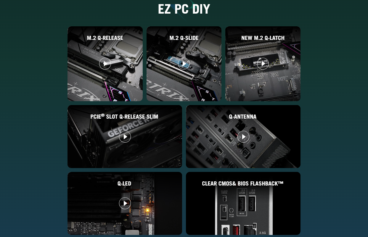 Extreme Engine Digi+ – 5K Black metallic capacitors ASUS Q-Design – M.2 Q-Latch – M.2 Q-Release – M.2 Q-Slide – PCIe Slot Q-Release Slim (with PCIe SafeSlot) – Q-Antenna – Q-Dashboard – Q-DIMM – Q-LED (CPU [red], DRAM [yellow], VGA [white], Boot Device [yellow green]) – Q-Slot ASUS Thermal Solution – M.2 heatsink backplate – M.2 heatsink ASUS EZ DIY – BIOS FlashBack™ button – BIOS FlashBack™ LED – Clear CMOS button – ProCool – Pre-mounted I/O shield – SafeSlot – SafeDIMM Aura Sync – Addressable Gen 2 headers