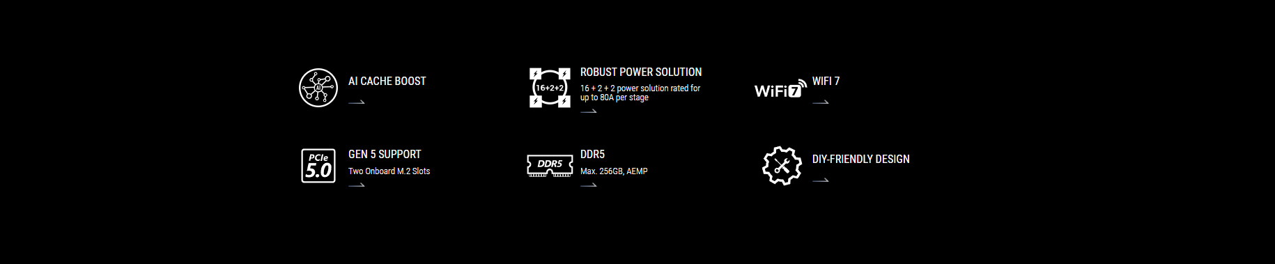 Wi-Fi 7* 2×2 Wi-Fi 7 (802.11be) Supports 2.4/5/6GHz frequency band** Supports Wi-Fi 7 160MHz bandwidth, up to 2.9Gbps transfer rate. Bluetooth® v5.4*** *Wi-Fi features may vary depending on the operating system For Windows 11, Wi-Fi 7 will require 24H2 or later version for full functions, Windows 11 21H2/22H2/23H2 only supports Wi-Fi 6E. For Windows 10, please note that no driver is available, refer to the Wi-Fi chipset vendor’s website for details. ** Wi-Fi 6GHz frequency band and bandwidth regulatory may vary between countries. *** The Bluetooth® version may vary, please refer to the Wi-Fi module manufacturer’s website for the latest specifications.