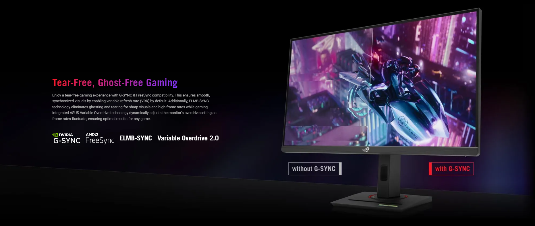ASUS Extreme Low Motion Blur Sync (ELMB SYNC) technology enables ELMB together with variable refresh rate, eliminating ghosting and tearing for sharp gaming visuals with high frame rates.