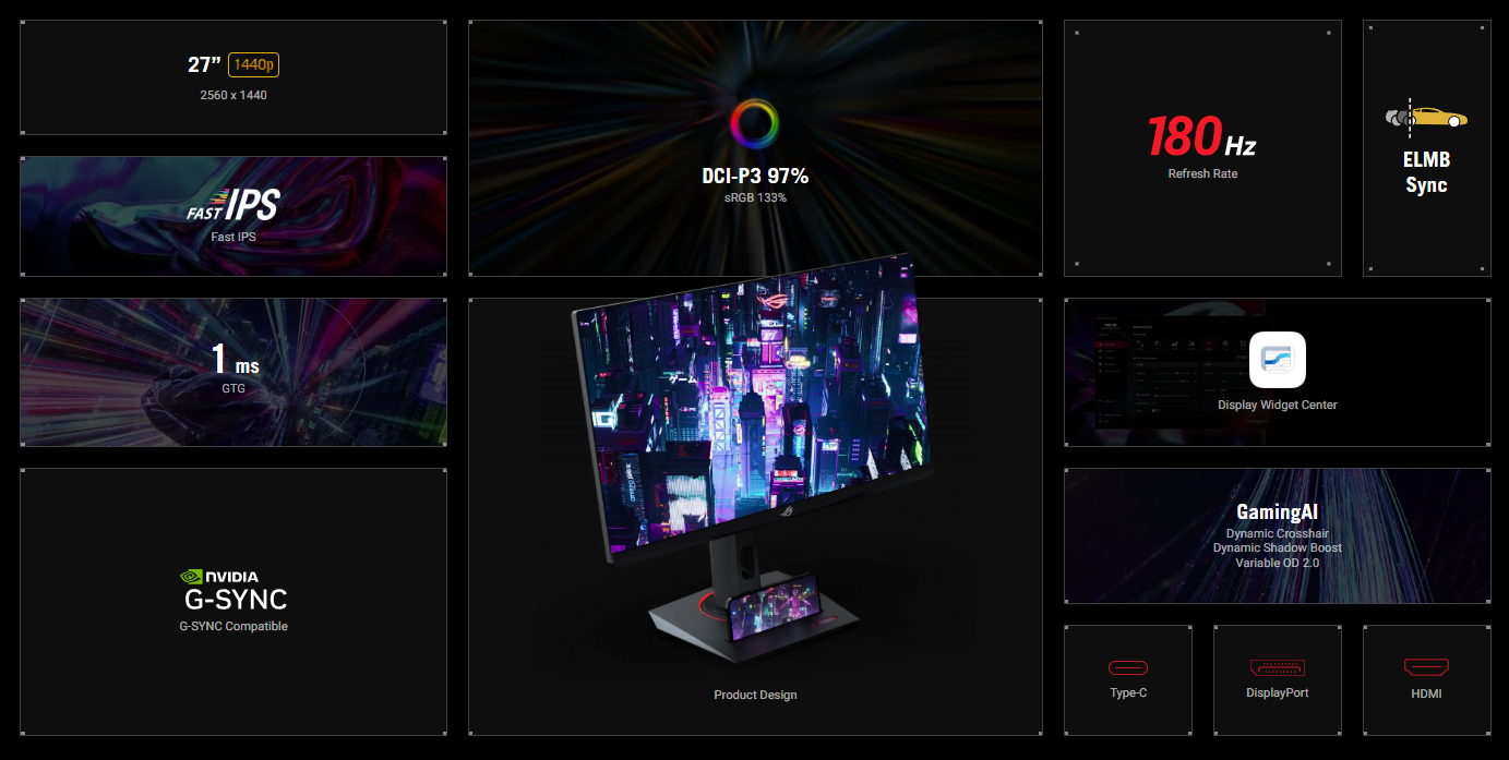 ROG Strix XG27ACS USB Type-C Gaming Monitor – 27-inch 2560×1440, 180Hz (Above 144Hz), 1ms (GTG), Fast IPS, Extreme Low Motion Blur Sync, USB Type-C, G-Sync compatible, DisplayWidget Center, tripod socket, HDR