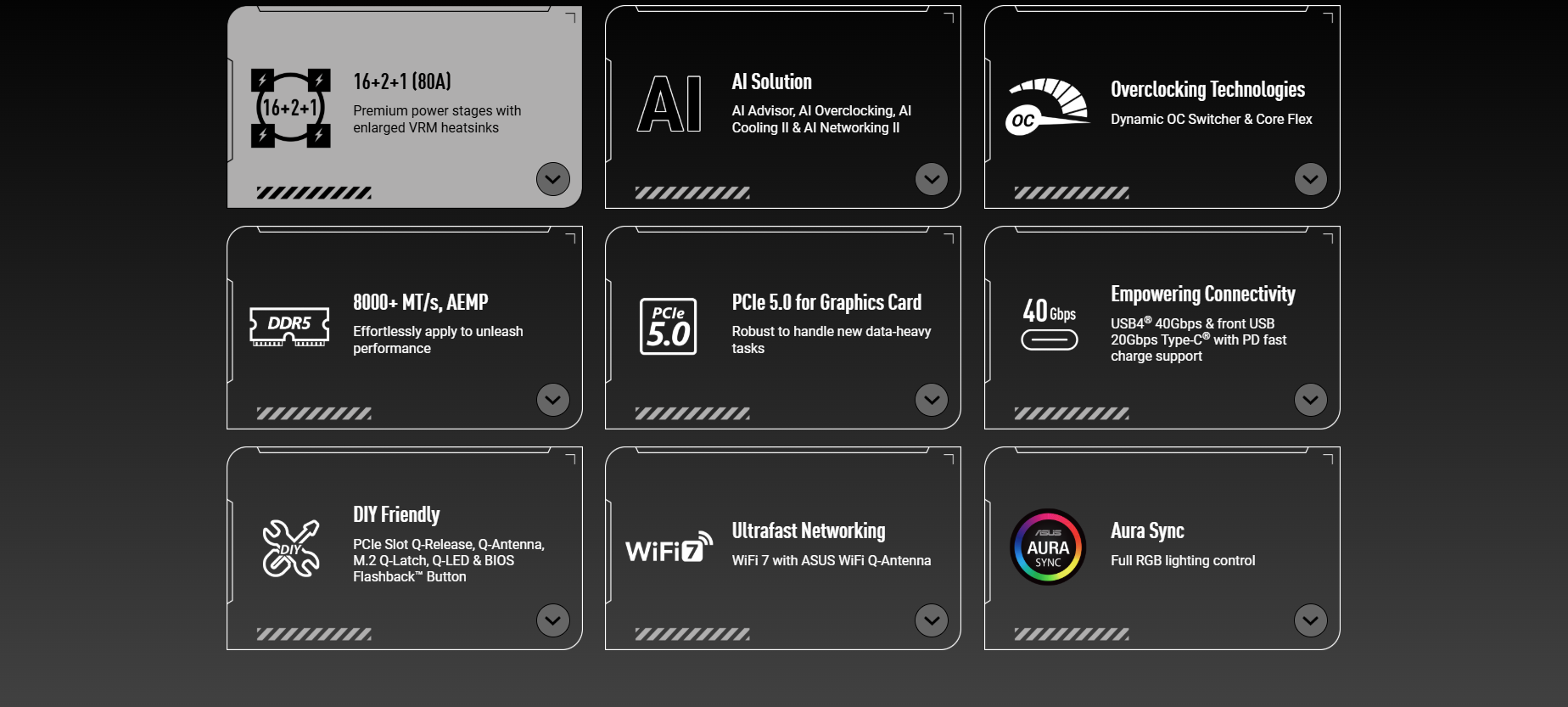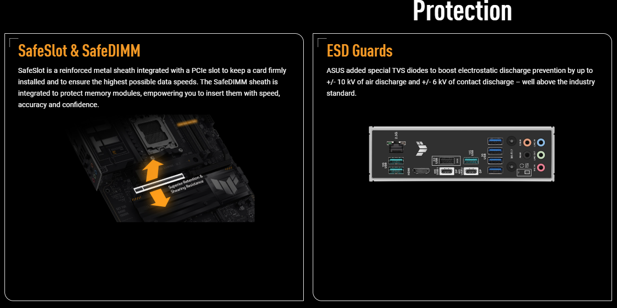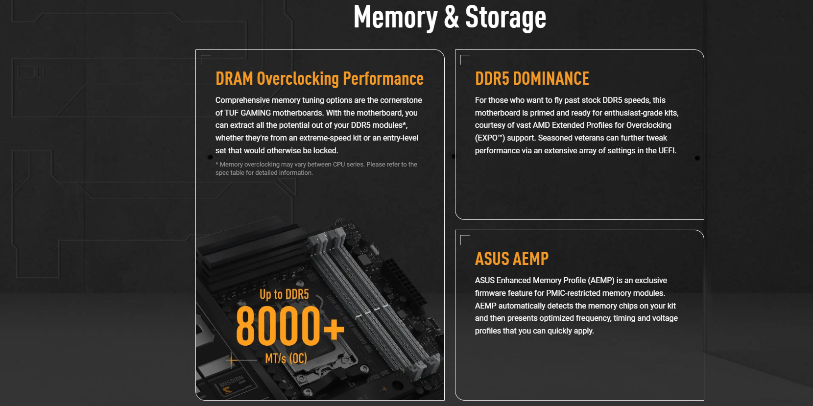 4 x DIMM slots, max. 256GB, DDR5 Supports up to 8000+MT/s(OC) with Ryzen™ 9000 & 8000 & 7000 Series Processors ECC and Non-ECC, Un-buffered DIMM* Dual channel memory architecture Supports AMD Extended Profiles for Overclocking (EXPO™) ASUS Enhanced Memory Profile (AEMP) * Adjustments will be made based on the specifications of mass-produced memory products available on the market. * Supported memory types, data rate (speed), and number of DRAM modules vary depending on the CPU and memory configuration, for more information please refer to CPU/Memory Support list under the Support tab of product information site or visit https://www.asus.com/support/download-center/. * Non-ECC, un-buffered DDR5 memory supports On-Die ECC function.