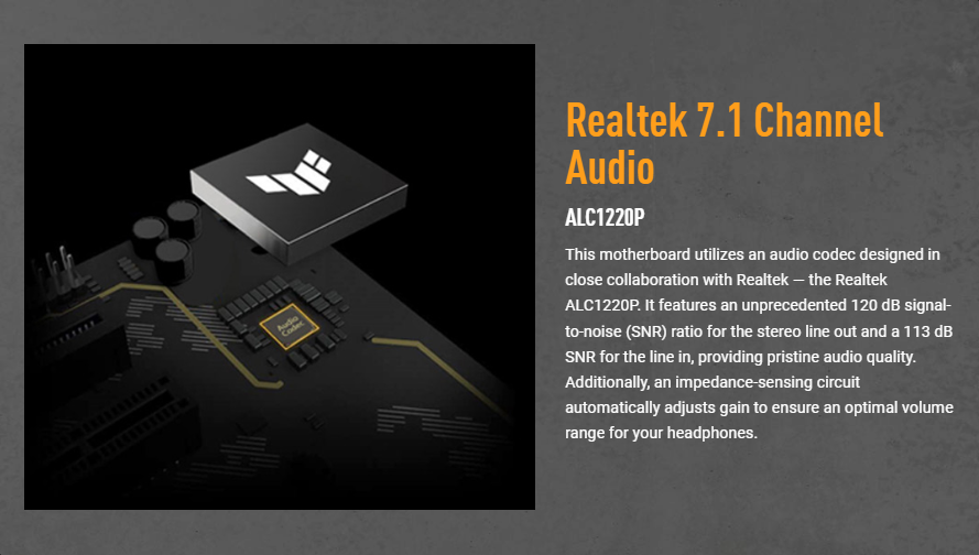 Realtek ALC1220P 7.1 Surround Sound High Definition Audio CODEC – Impedance sense for front and rear headphone outputs – Internal audio Amplifier to enhance the highest quality sound for headphone and speakers – Supports: Jack-detection, Multi-streaming, Front Panel Jack-retasking – High quality 120 dB SNR stereo playback output and 113 dB SNR recording input (Line-in) – Supports up to 32-Bit/192 kHz playback* Audio Features – Audio Shielding – Premium audio capacitors – Dedicated audio PCB layers – Audio cover – Unique de-pop circuit * Due to limitations in HDA bandwidth, 32-Bit/192 kHz is not supported for 7.1 Surround Sound audio.