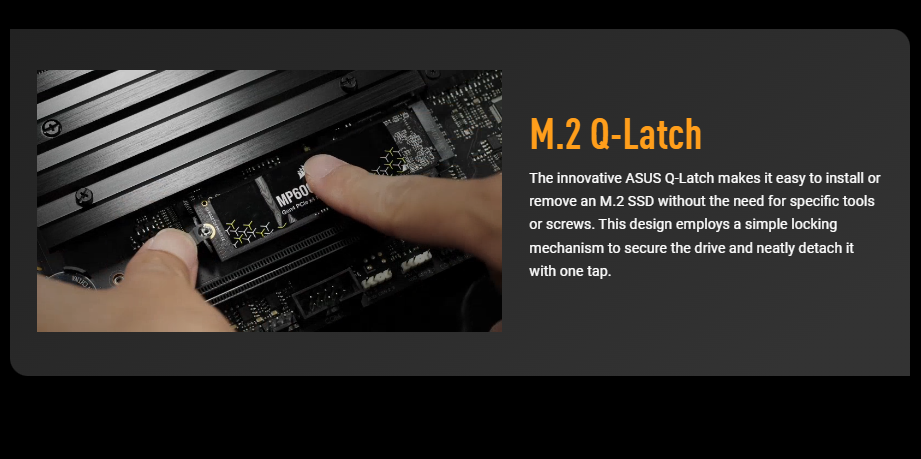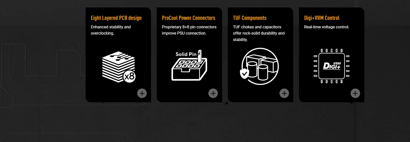 ASUS TUF PROTECTION – DIGI+ VRM (- Digital power design with SPS) – ESD Guards – TUF LANGuard – Overvoltage protection – SafeSlot – Stainless-steel back I/O ASUS Q-Design – M.2 Q-Latch – PCIe Slot Q-Release – Q-Antenna – Q-Dashboard – Q-DIMM – Q-LED (CPU [red], DRAM [yellow], VGA [white], Boot Device [yellow green]) – Q-Slot ASUS Thermal Solution – M.2 heatsinks – VRM heatsink design ASUS EZ DIY – BIOS FlashBack™ button – BIOS FlashBack™ LED – ProCool – Pre-mounted I/O shield – SafeDIMM Aura Sync – Addressable Gen 2 headers Front Panel USB 20Gbps with PD Fast Charge Support – Support: up to 30W fast charging and USB Wattage Watcher – Output: 5V/9V max. 3A, 12V max. 2.5A, 15V max. 2A – Compatible with PD3.0