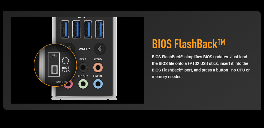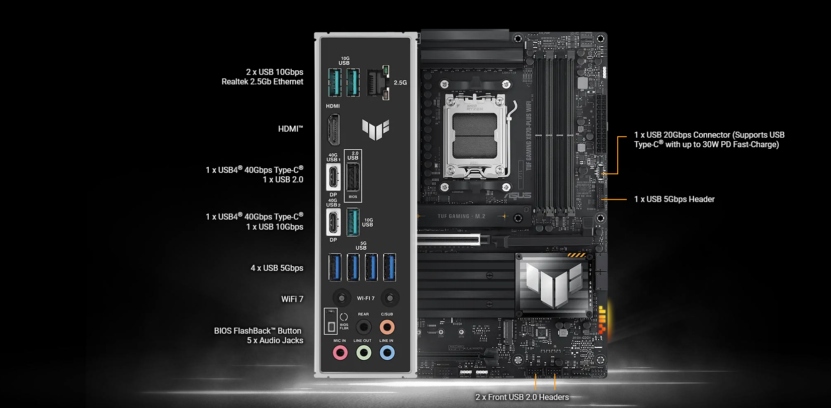 2 x USB4® (40Gbps) (2 x USB Type-C®) ports 3 x USB 10Gbps ports (3 x Type-A) 4 x USB 5Gbps ports (4 x Type-A) 1 x USB 2.0 port (1 x Type-A) 1 x HDMI™ port 1 x Wi-Fi module 1 x Realtek 2.5Gb Ethernet port 5 x Audio jacks 1 x BIOS FlashBack™ button