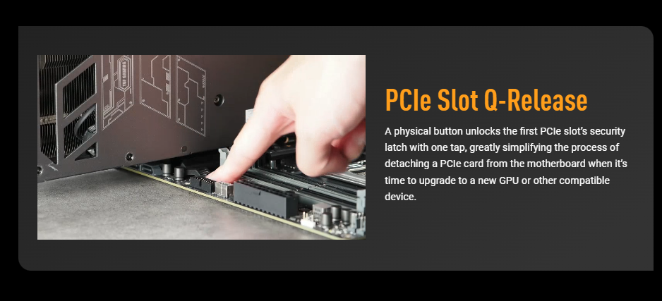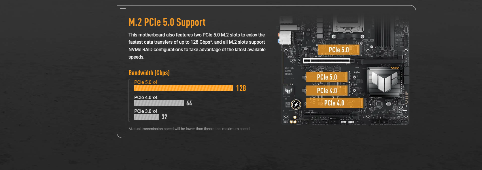 AMD Ryzen™ 9000 & 7000 Series Desktop Processors* 1 x PCIe 5.0 x16 slot (supports x16 mode)** AMD Ryzen™ 8000 Series Desktop Processors 1 x PCIe 4.0 x16 slot (supports x8/x4 mode)*** AMD X870 Chipset 1 x PCIe 4.0 x16 slot (supports x4 mode)**** * Please check the PCIe bifurcation table on the support site (https://www.asus.com/support/FAQ/1037507/). ** The PCIEX16(G5) shares bandwidth with M.2_2. The PCIEX16(G5) will run to x8 mode when M.2_2 runs. *** Specifications vary by CPU types. **** The PCIEX16(G4) shares bandwidth with M.2_4. The PCIEX16(G4) will be disabled when M.2_4 runs. – To ensure compatibility of the device installed, please refer to https://www.asus.com/support/download-center/ for the list of supported peripherals.