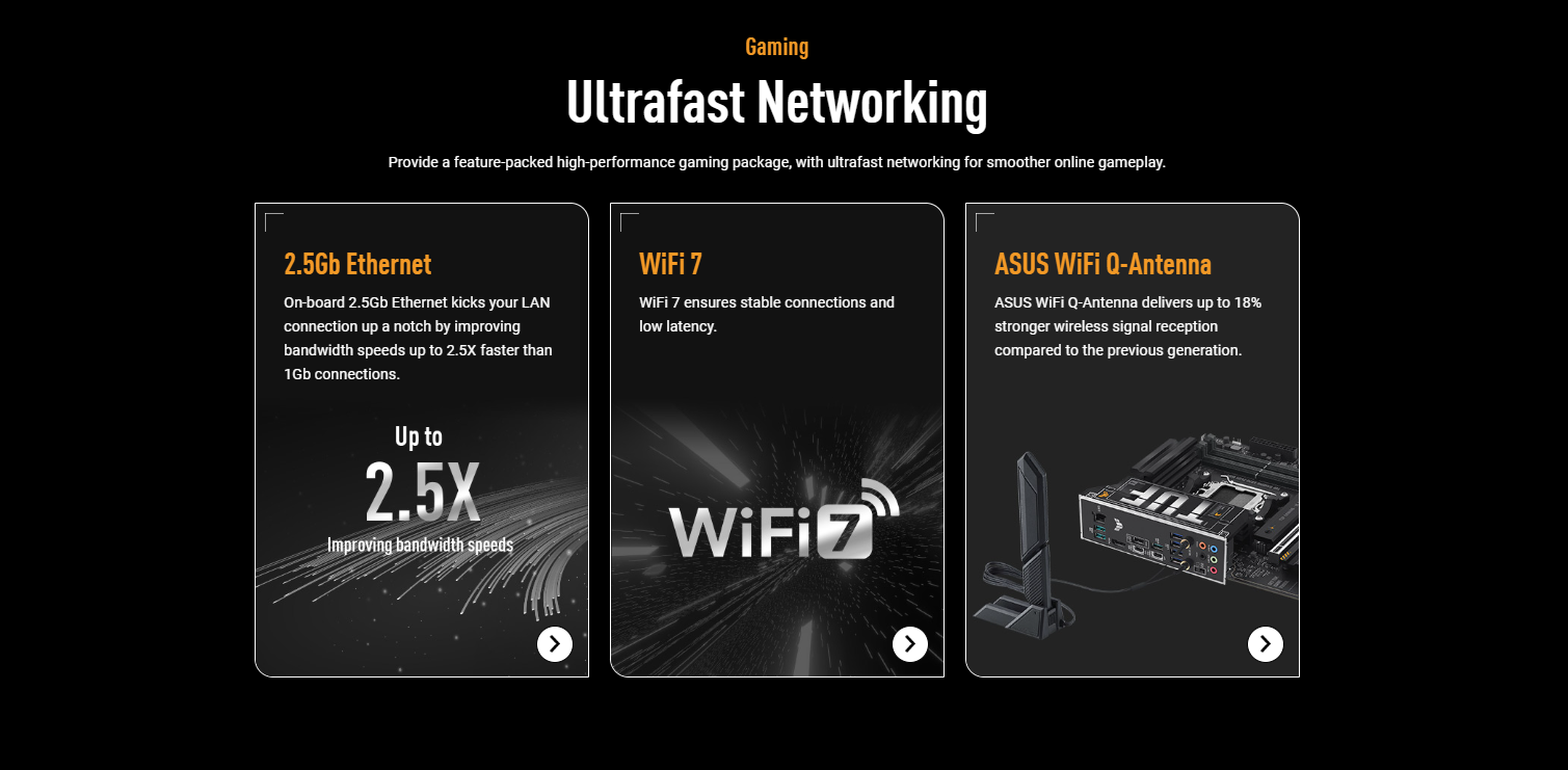 Wi-Fi 7* 2×2 Wi-Fi 7 (802.11be) Supports 2.4/5/6GHz frequency band** Supports Wi-Fi 7 160MHz bandwidth, up to 2.9Gbps transfer rate. Bluetooth® v5.4*** *Wi-Fi features may vary depending on the operating system For Windows 11, Wi-Fi 7 will require 24H2 or later version for full functions, Windows 11 21H2/22H2/23H2 only support Wi-Fi 6E. ** Wi-Fi 6GHz frequency band and bandwidth regulatory may vary between countries. *** The Bluetooth® version may vary, please refer to the Wi-Fi module manufacturer’s website for the latest specifications.