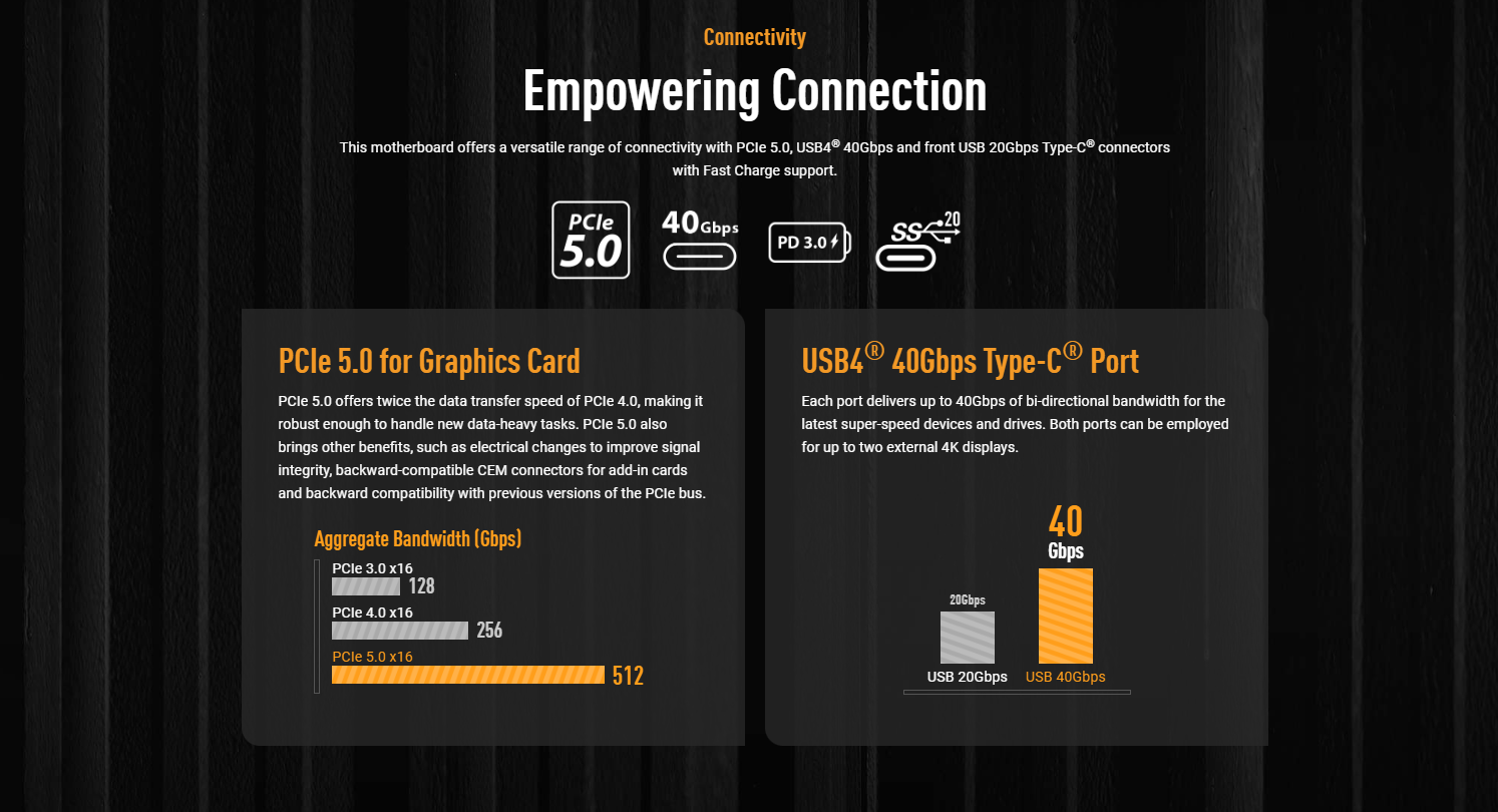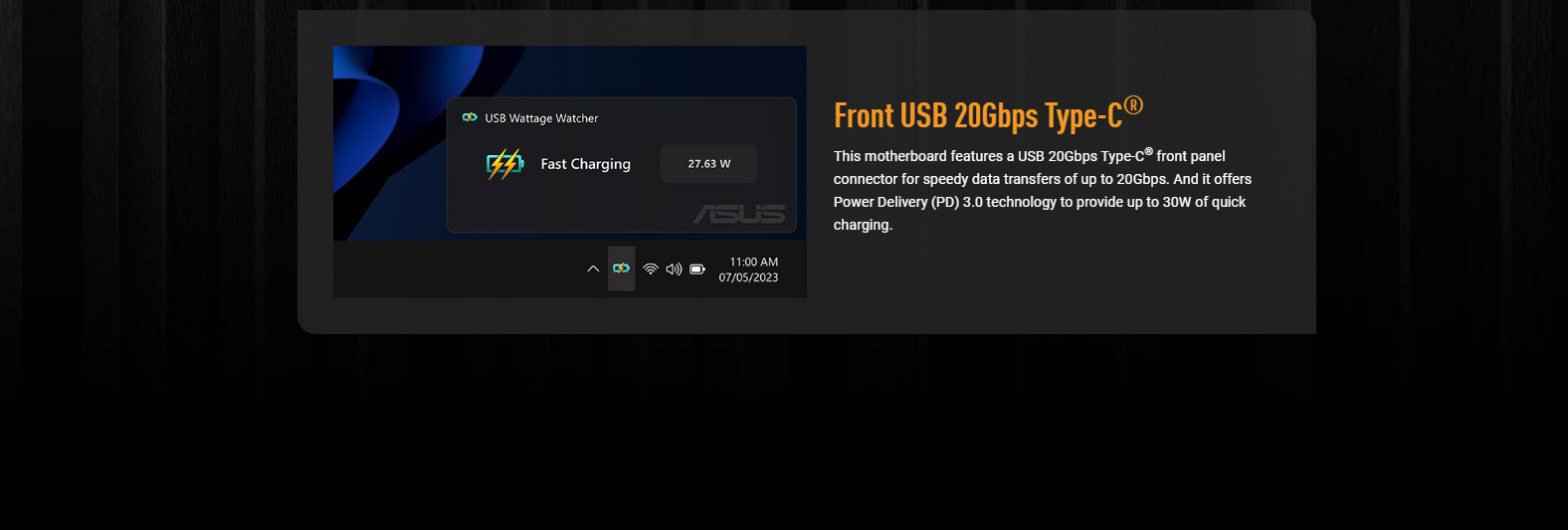 Rear USB (Total 10 ports) 2 x USB4® (40Gbps) ports (2 x USB Type-C®)* 3 x USB 10Gbps ports (3 x Type-A) 4 x USB 5Gbps ports (4 x Type-A) 1 x USB 2.0 port (1 x Type-A) Front USB (Total 7 ports) 1 x USB 20Gbps connector (supports USB Type-C® with up to 30W PD Fast-charge)** 1 x USB 5Gbps header supports 2 additional USB 5Gbps ports 2 x USB 2.0 headers support 4 additional USB 2.0 ports * USB Type-C® power delivery output: max. 5V/3A ** USB Type-C® power delivery output: 5V/9V max. 3A, 12V max. 2.5A, 15V max. 2A.