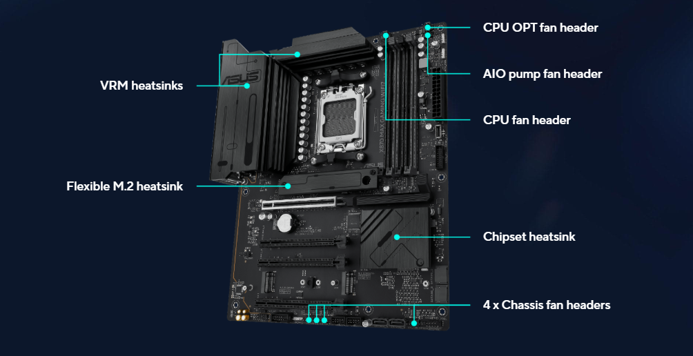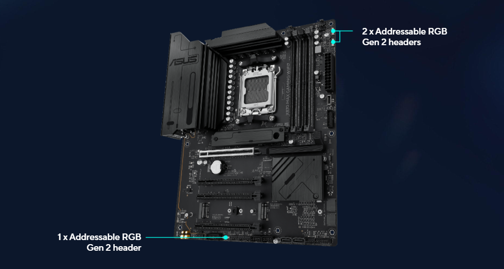 Fan and Cooling Related 1 x 4-pin CPU Fan header 1 x 4-pin CPU OPT Fan header 1 x 4-pin AIO Pump header 4 x 4-pin Chassis Fan headers Power Related 1 x 24-pin Main Power connector 2 x 8-pin +12V CPU Power connectors Storage Related 3 x M.2 slots (Key M) 4 x SATA 6Gb/s ports USB 1 x USB 20Gbps connector (supports USB Type-C®) 1 x USB 5Gbps header supports 2 additional USB 5Gbps ports 2 x USB 2.0 headers support 4 additional USB 2.0 ports Miscellaneous 3 x Addressable RGB Gen 2 headers 1 x Clear CMOS header 1 x Chassis Intrusion header 1 x COM Port header 1 x Front Panel Audio header (F_AUDIO) 1 x S/PDIF Out header 1 x SPI TPM header (14-1 pin) 1 x 10-1 pin System Panel header