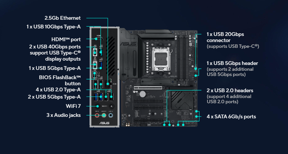 2 x USB4® (40Gbps) ports (2 x USB Type-C®) 1 x USB 10Gbps port (1 x Type-A) 3 x USB 5Gbps ports (3 x Type-A) 4 x USB 2.0 ports (4 x Type-A) 1 x HDMI™ port 1 x Wi-Fi module 1 x Realtek 2.5Gb Ethernet port 3 x Audio jacks 1 x BIOS FlashBack™ button