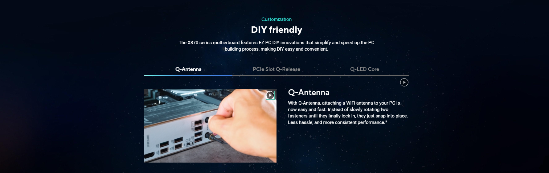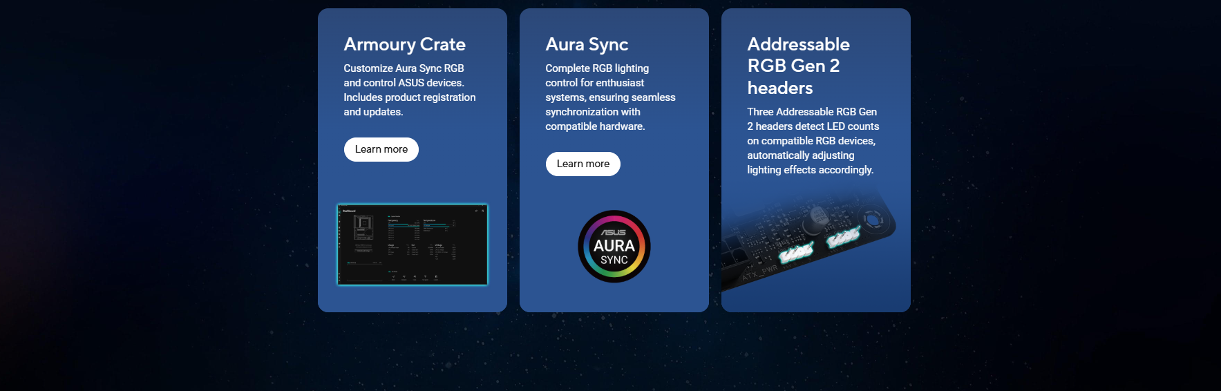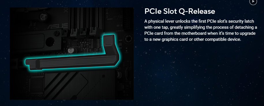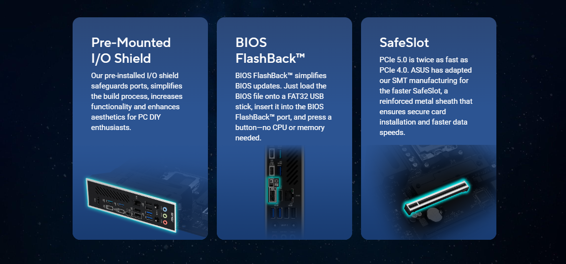 ASUS 5X PROTECTION III – DIGI+ VRM (- Digital power design with DrMOS) – LANGuard – Overvoltage protection – SafeSlot – Stainless-steel back I/O ASUS Q-Design – PCIe Slot Q-Release – Q-Antenna – Q-Dashboard – Q-DIMM – Q-LED Core – Q-Slot ASUS Thermal Solution – Flexible M.2 heatsink – VRM heatsink design ASUS EZ DIY – BIOS FlashBack™ button – BIOS FlashBack™ LED – ProCool – Pre-mounted I/O shield – SafeSlot Aura Sync – Addressable RGB Gen 2 headers