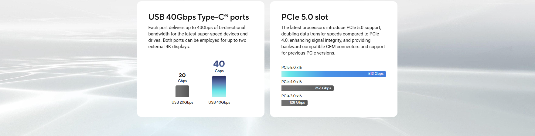 1 x HDMI™ port** 2 x USB4® (40Gbps) ports support USB Type-C® display outputs*** * Graphics specifications may vary between CPU types. Please refer to AMD CPU specifications. ** Supports 4K@60Hz as specified in HDMI 2.1. *** Supports max. 4K@60Hz as specified in DisplayPort 1.4a. *** VGA resolution support depends on processors’ or graphic cards’ resolution.