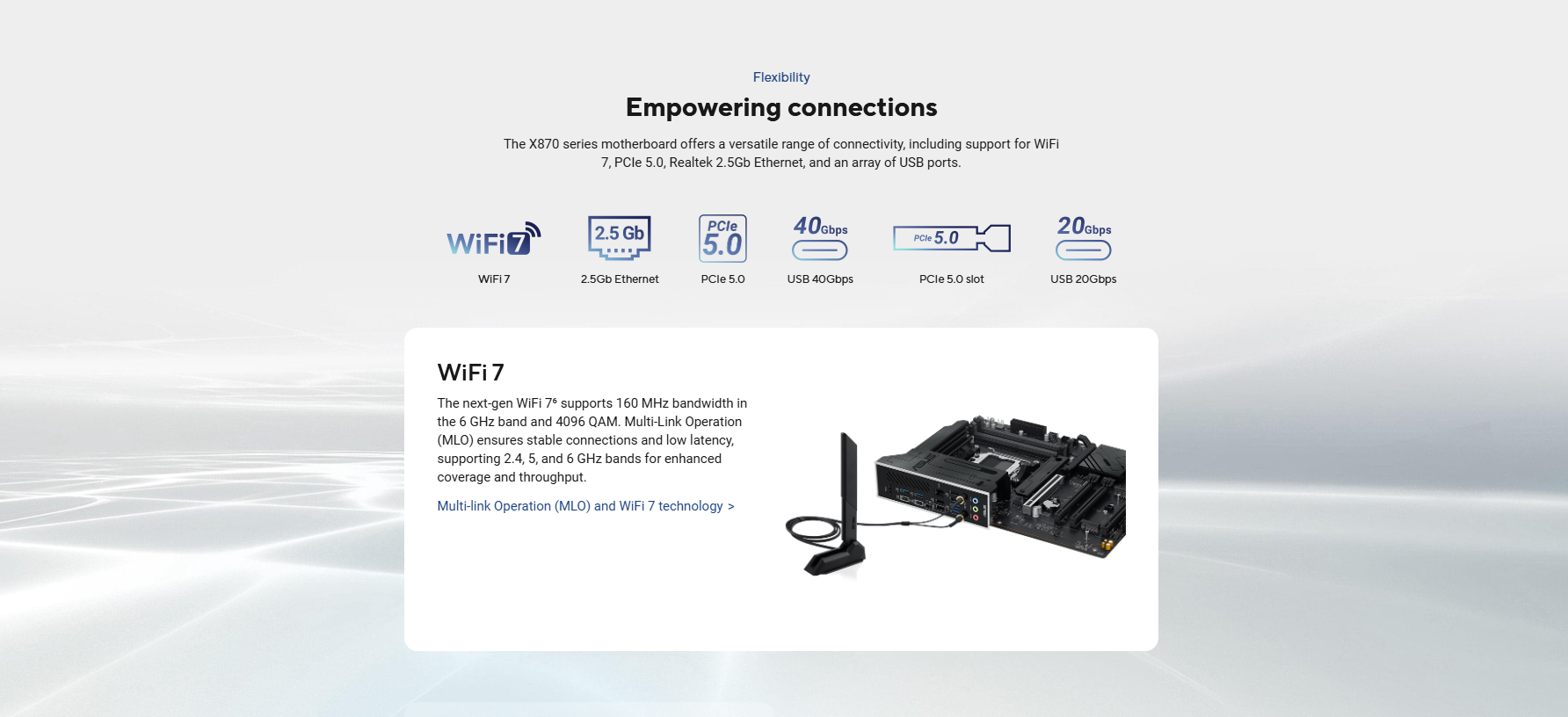 Wi-Fi 7* 2×2 Wi-Fi 7 (802.11be) Supports 2.4/5/6GHz frequency band** Supports Wi-Fi 7 160MHz bandwidth, up to 2.9Gbps transfer rate. Bluetooth® v5.4*** * Wi-Fi features may vary depending on the operating system. For Windows 11, Wi-Fi 7 will require 24H2 or later version for full functions, Windows 11 21H2/22H2/23H2 only supports Wi-Fi 6E. For Windows 10, only Wi-Fi 6 is supported. ** Wi-Fi 6GHz frequency band and bandwidth regulatory may vary between countries. *** The Bluetooth® version may vary, please refer to the Wi-Fi module manufacturer’s website for the latest specifications.