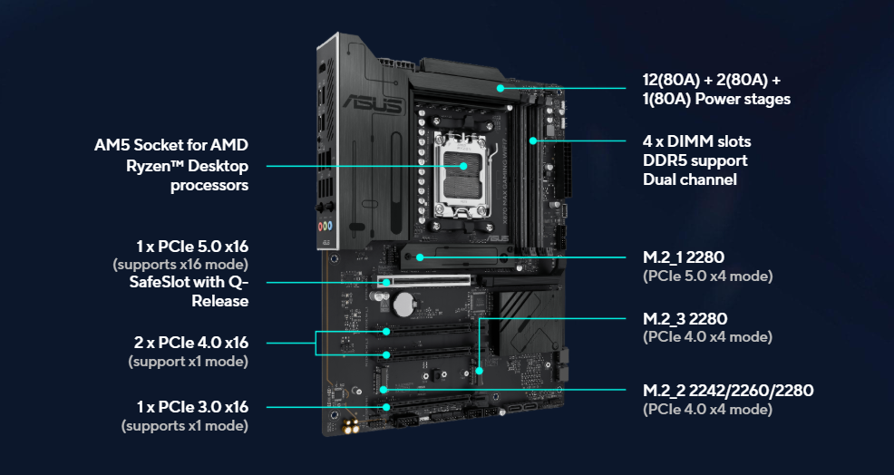 AMD Ryzen™ 9000 & 7000 Series Desktop Processors* 1 x PCIe 5.0 x16 slot (supports x16 mode) AMD Ryzen™ 8000 Series Desktop Processors 1 x PCIe 4.0 x16 slot (supports x8/x4 mode)** AMD X870 Chipset 2 x PCIe 4.0 x16 slots (support x1 mode) 1 x PCIe 3.0 x16 slot (supports x1 mode)*** * Please check the PCIe bifurcation table on the support site (https://www.asus.com/support/FAQ/1037507/). ** Specifications vary by CPU types. *** PCIEX16(G3) slot shares bandwidth with SATA6G_3 and SATA6G_4 ports. Both SATA ports will be disabled when PCIEX16(G3) slot is running. You can enter the BIOS to adjust the default Settings as required. – To ensure compatibility of the device installed, please refer to https://www.asus.com/support/download-center/ for the list of supported peripherals.