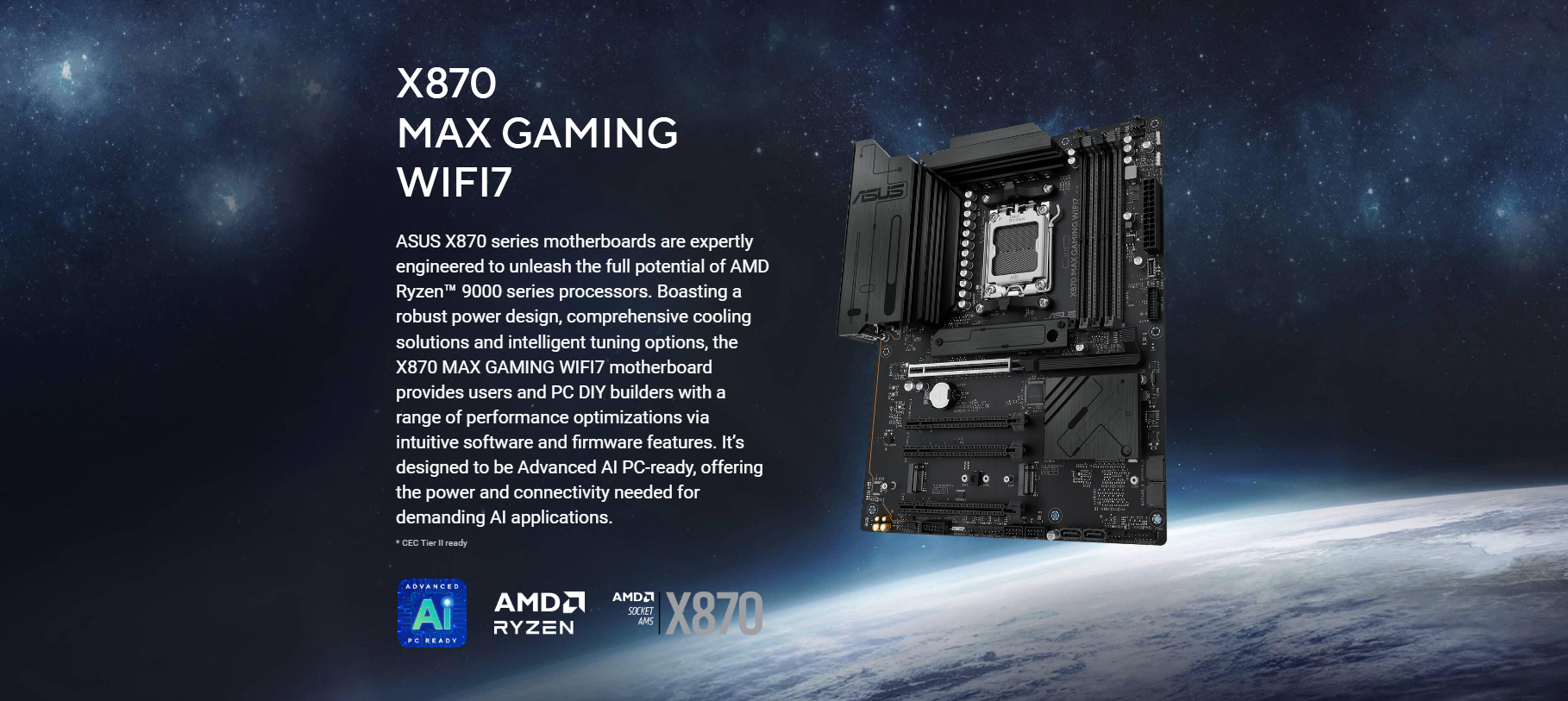 AMD Socket AM5 for AMD Ryzen™ 9000 & 8000 & 7000 Series Desktop Processors* * Refer to https://www.asus.com/support/download-center/ for CPU support list.