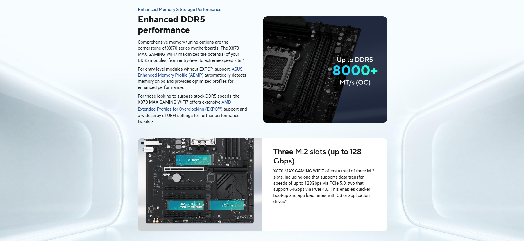 4 x DIMM slots, max. 256GB, DDR5 Supports up to 8000+MT/s(OC) with Ryzen™ 9000 & 8000 & 7000 Series Processors ECC and Non-ECC, Un-buffered DIMM* Dual channel memory architecture Supports AMD Extended Profiles for Overclocking (EXPO™) ASUS Enhanced Memory Profile (AEMP) * Supported memory types, data rate (speed), and number of DRAM modules vary depending on the CPU and memory configuration, for more information please refer to CPU/Memory Support list under the Support tab of product information site or visit https://www.asus.com/support/download-center/. Adjustments will be made based on the specifications of mass-produced memory products available on the market. * Non-ECC, un-buffered DDR5 memory supports On-Die ECC function.