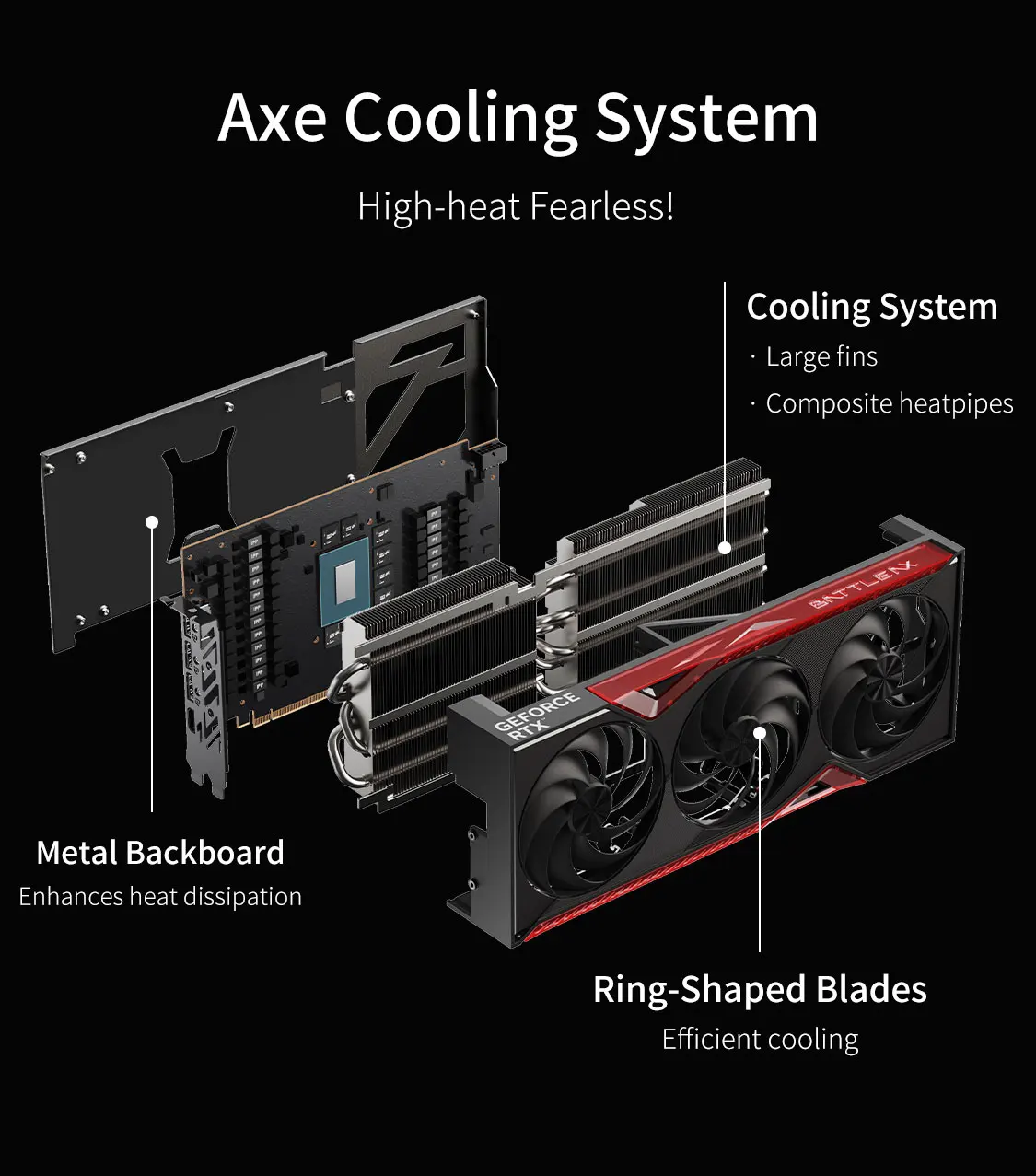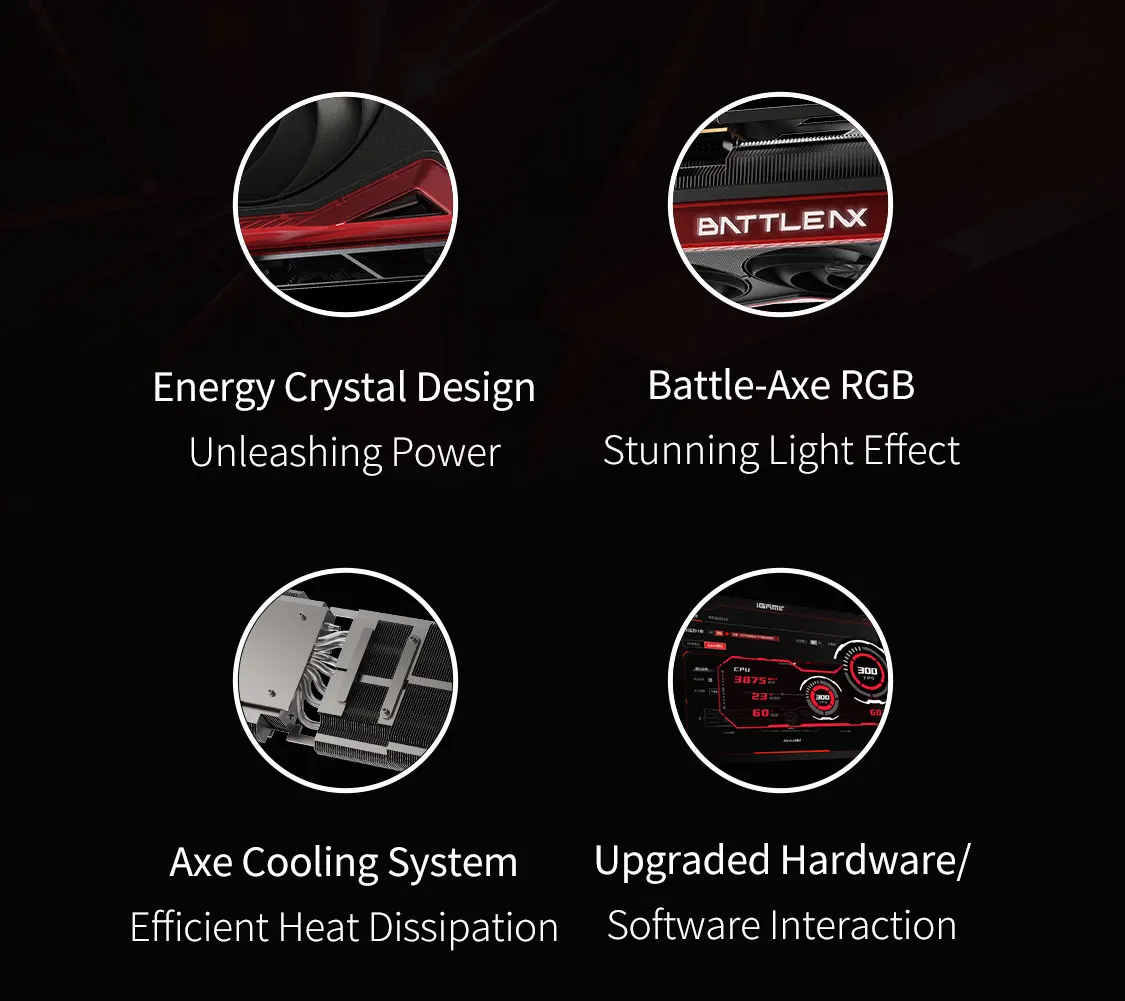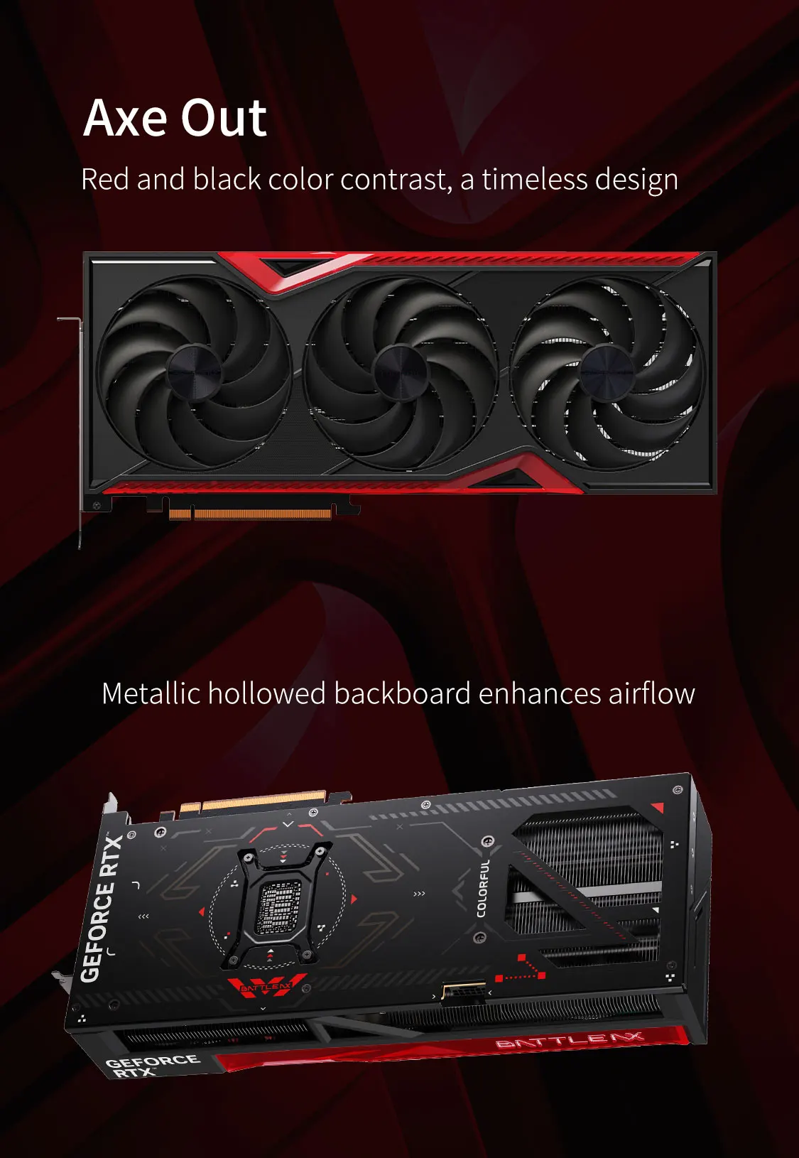 · Red and Black Color Contrast Design · Metallic Hollowed Backboard · Axe Cooling System with Ring-Shaped Fans · RGB Lighting Effect on the Side