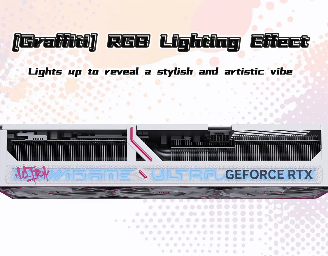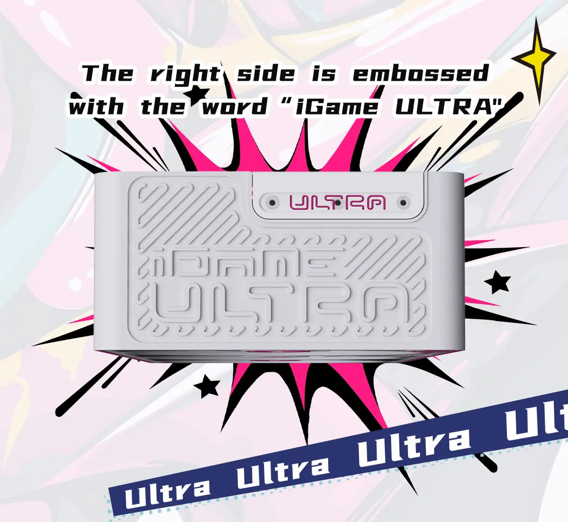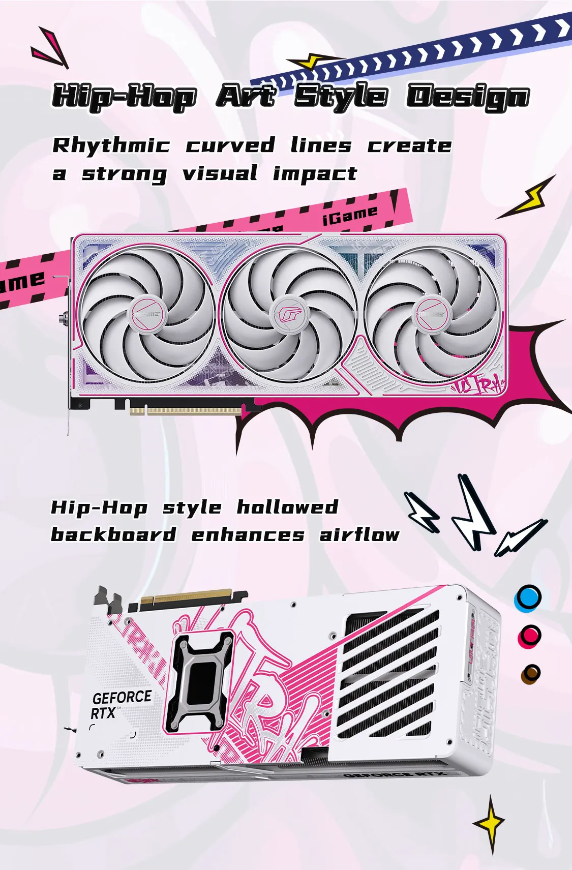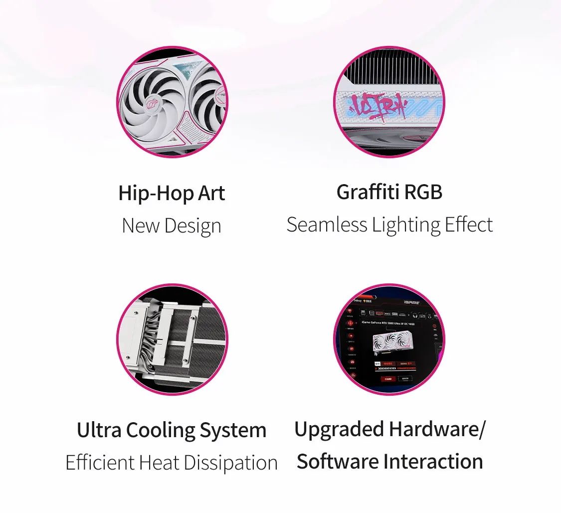 · White and Pink Color Scheme · Hip-Hop Style Hollowed Backboard · One-Key Overclock · Large Horizontal RGB Lighting Effects · Ultra Cooling System with Ring-Shaped Fans · “iGame ULTRA” Decorative Pattern