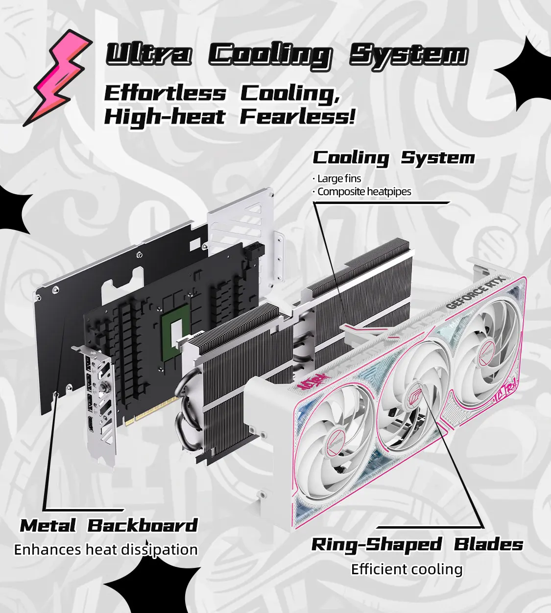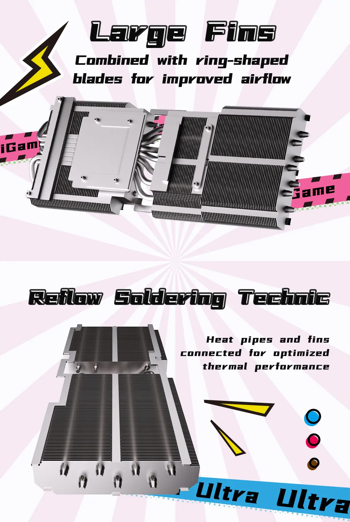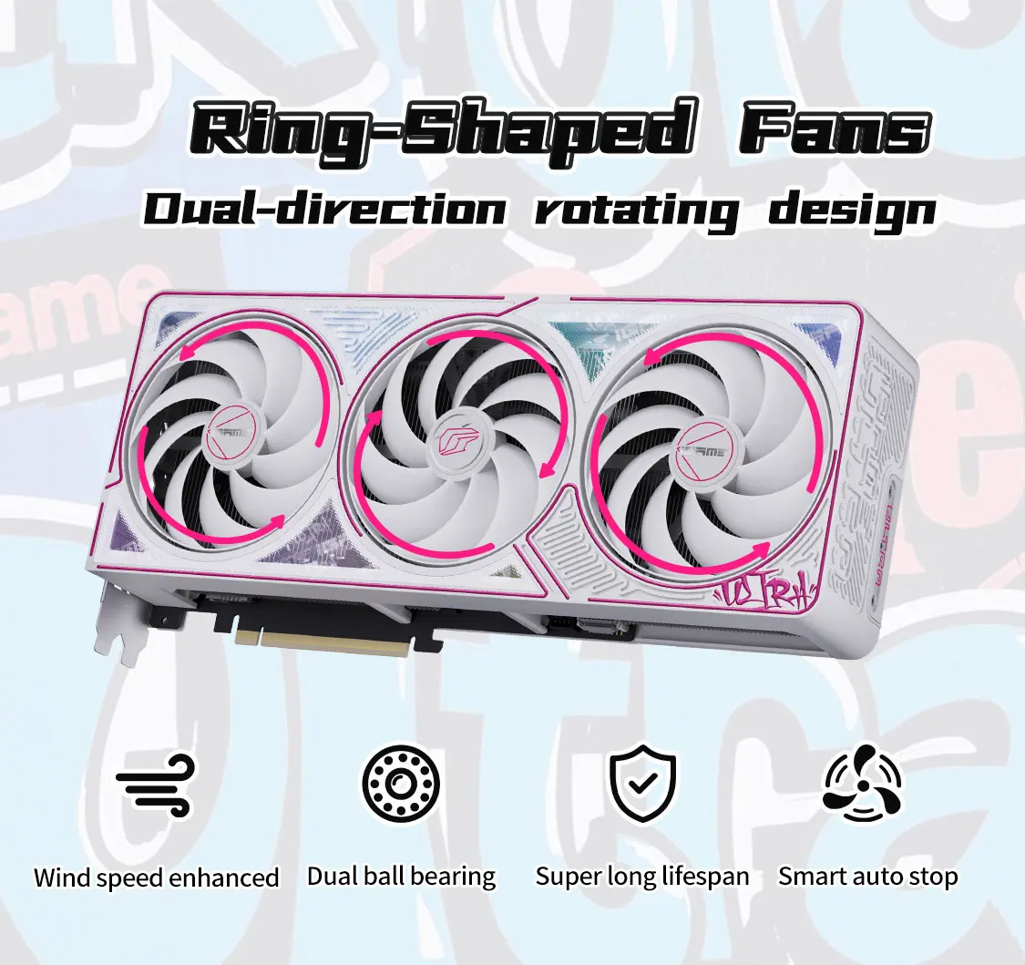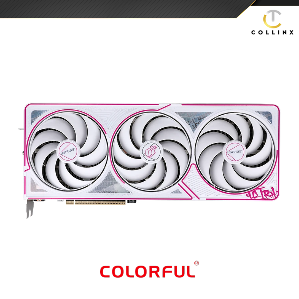 · White and Pink Color Scheme · Hip-Hop Style Hollowed Backboard · One-Key Overclock · Large Horizontal RGB Lighting Effects · Ultra Cooling System with Ring-Shaped Fans · “iGame ULTRA” Decorative Pattern