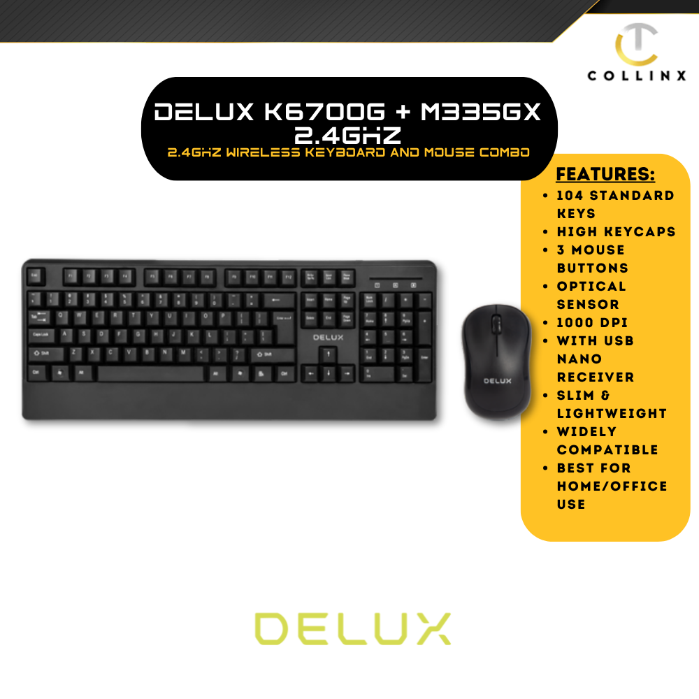 Unlock efficiency and style with the Delux K6700G + M335GX wireless keyboard and mouse combo! Equipped with 104 high-profile keys, laser-engraved durability, and seamless 2.4GHz connectivity—all powered by a simple AA battery. Designed for Windows 7/8/10, this duo is your new productivity powerhouse. Ready, set, type & click your way to success!