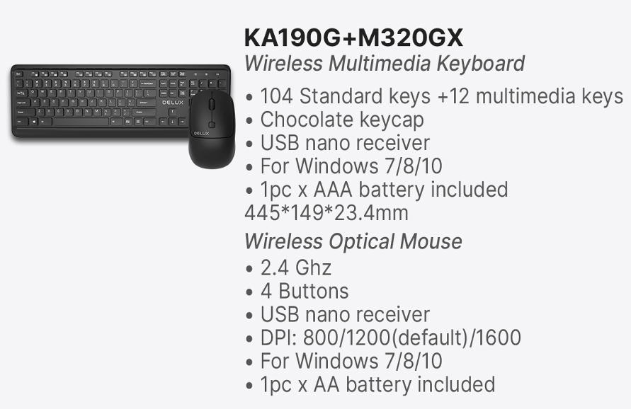 Delux KA190G + M320GX Wireless Multimedia Keyboard and Mouse Combo