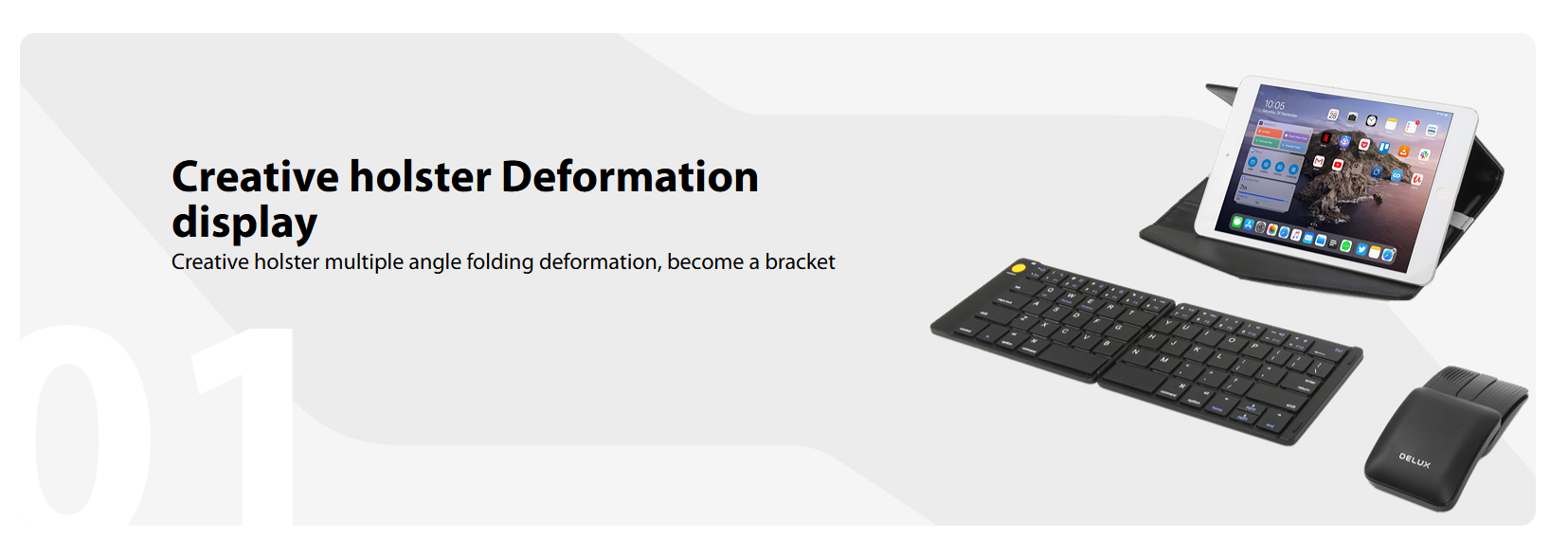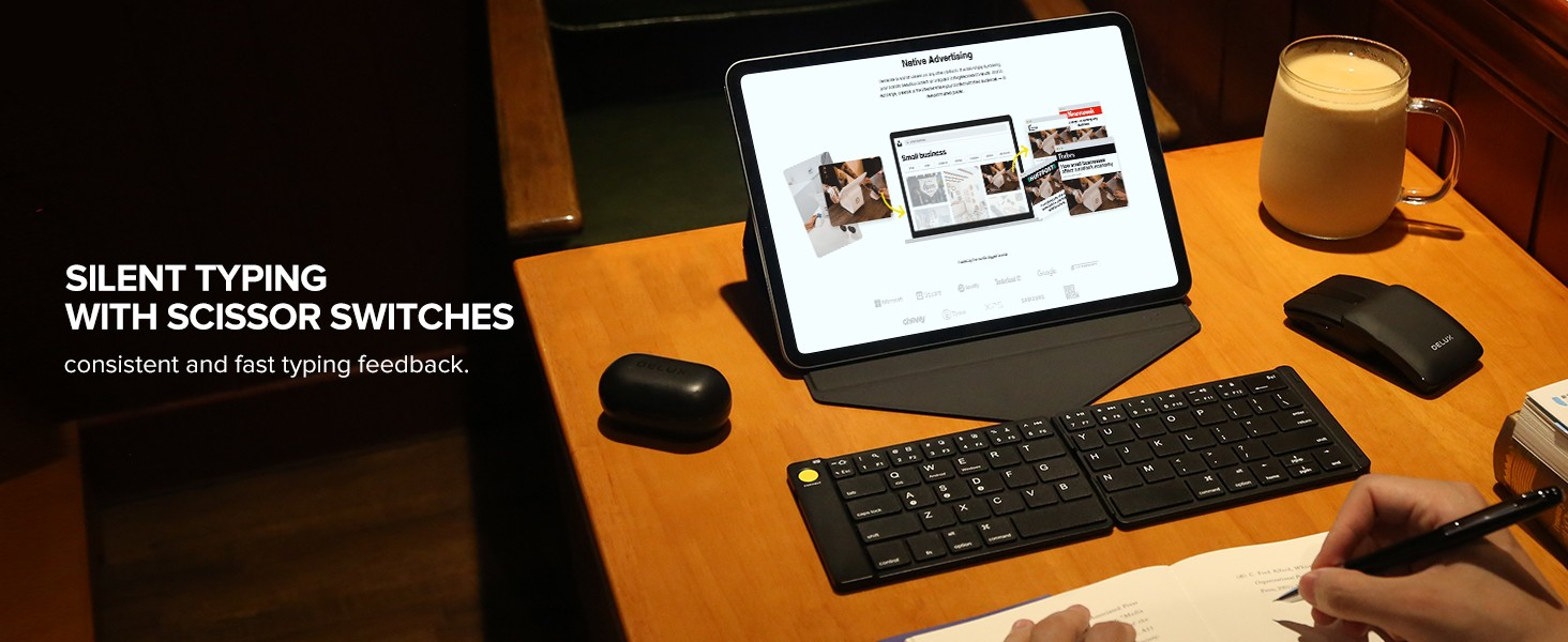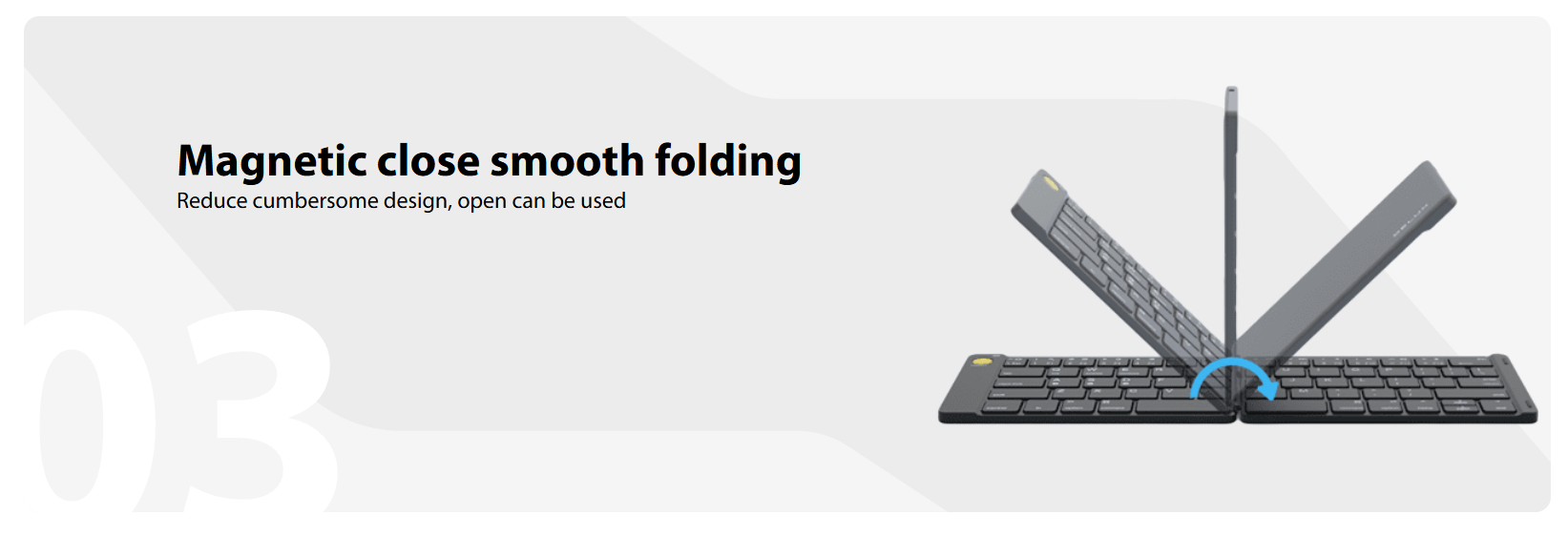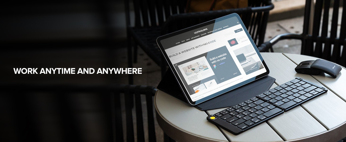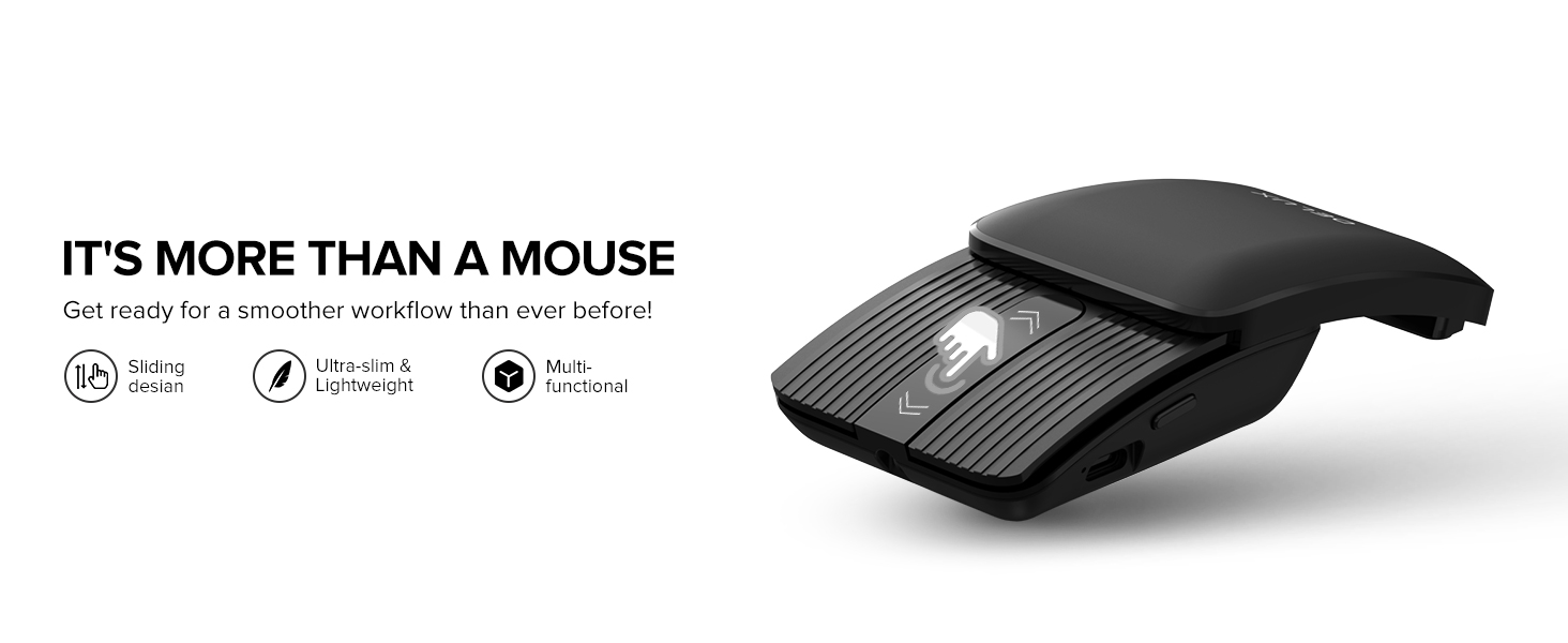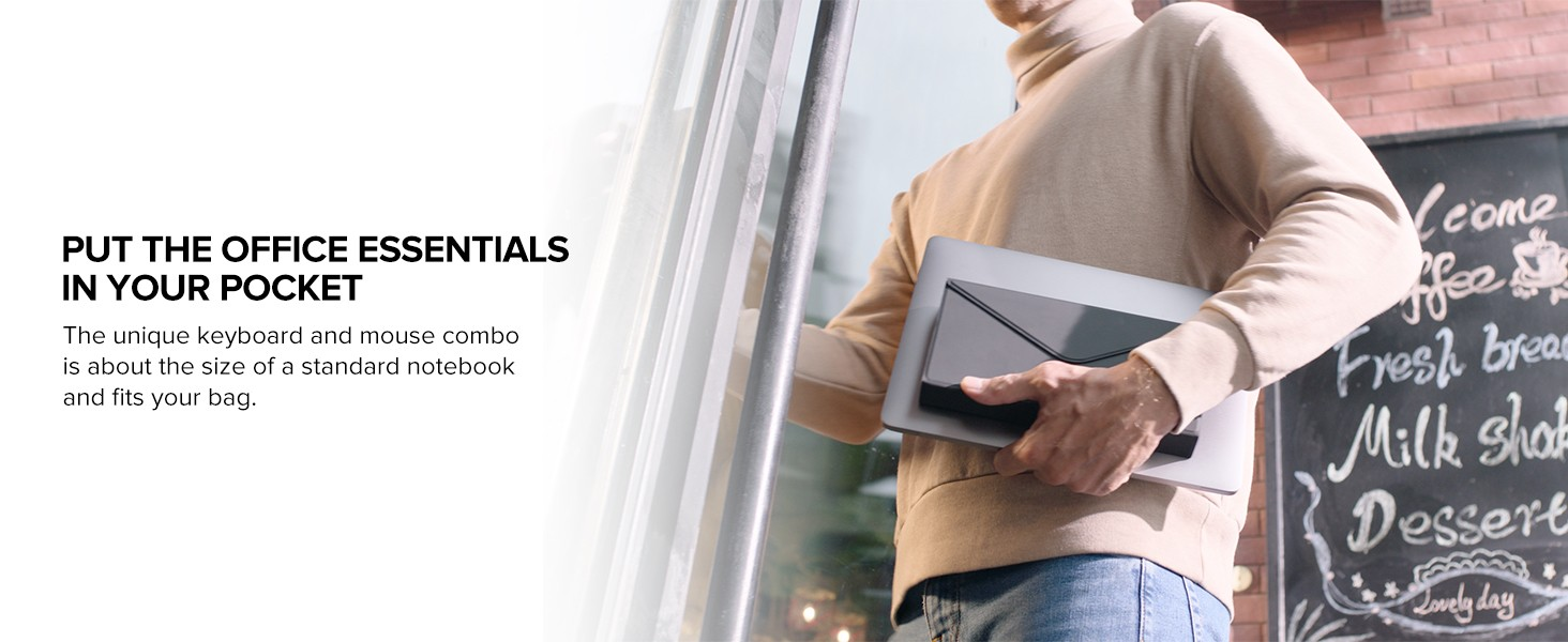 Pocket-sized Keyboard and Mouse Combo Work Anytime and Anywhere Stylish and Modern Design 1. Presenter mode- Touchable surface control To ensure an ergonomic fit and offer maximum comfort. 2. Ultra-slim- Foldable keyboard Typing naturally, typing better. 3. Presenter mode- Click the side button To highlight your points with the presenter. 4. Typing on anything Easily switch between different devices. 5. Put the office essentials in your pocket The unique keyboard and mouse combo is about the size of a standard notebook and fits your bag.