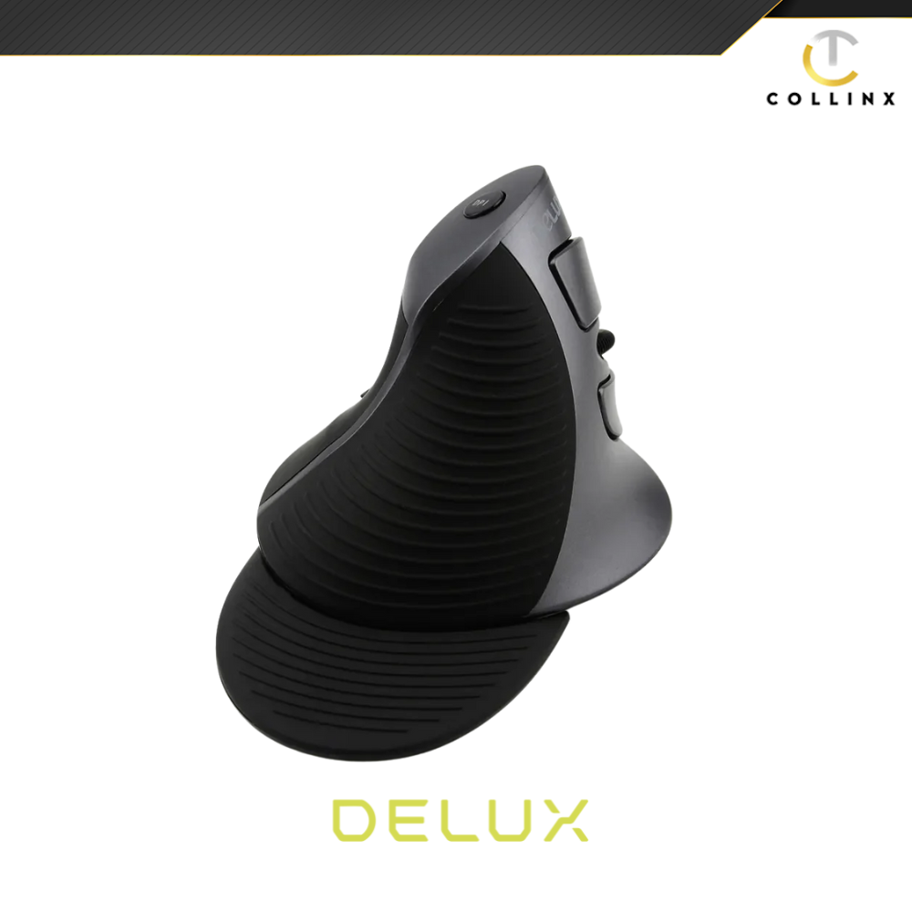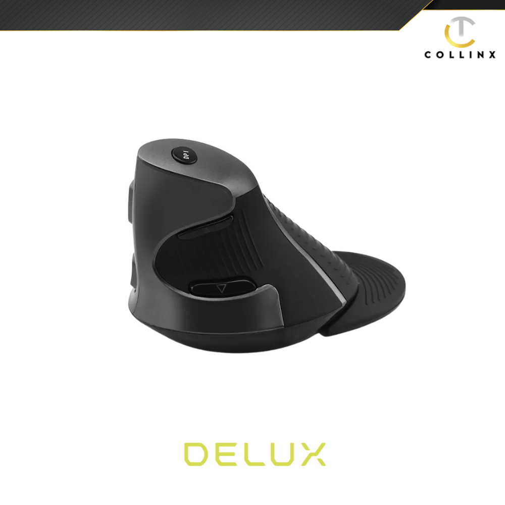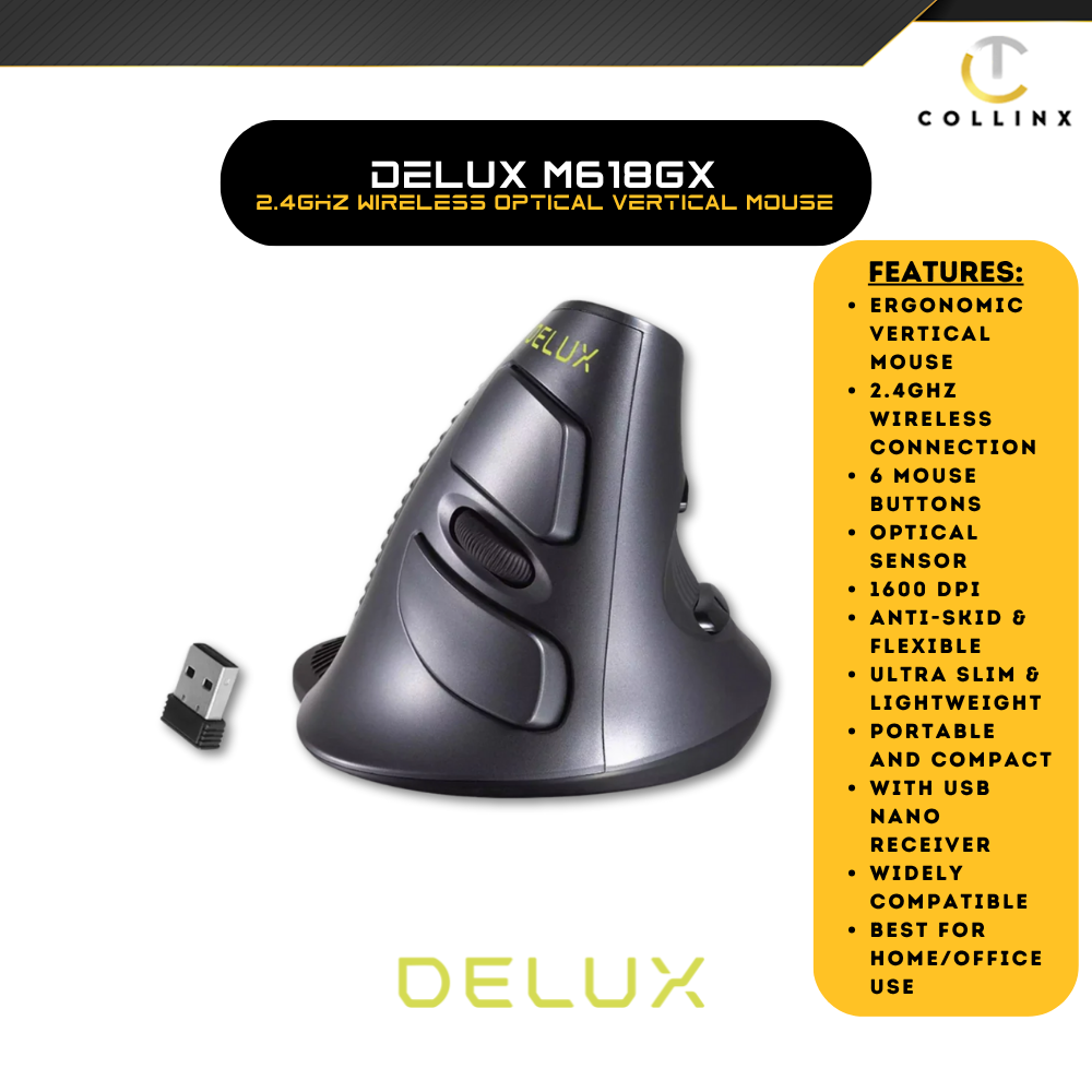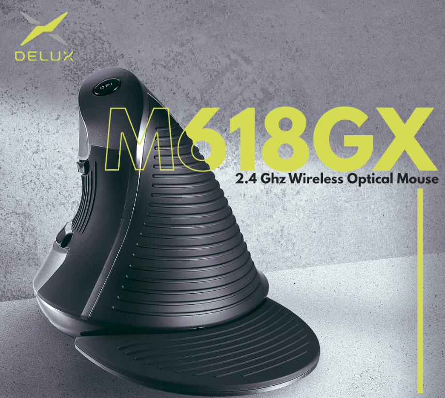 M618GX Ergo Vertical Mouse The Delux M618 wireless vertical mouse, adopts an ergonomic design, providing comfort for the user’s palm and wrist. The texture on the main body and palm rest has the function of antiskid. The mouse includes six function buttons.