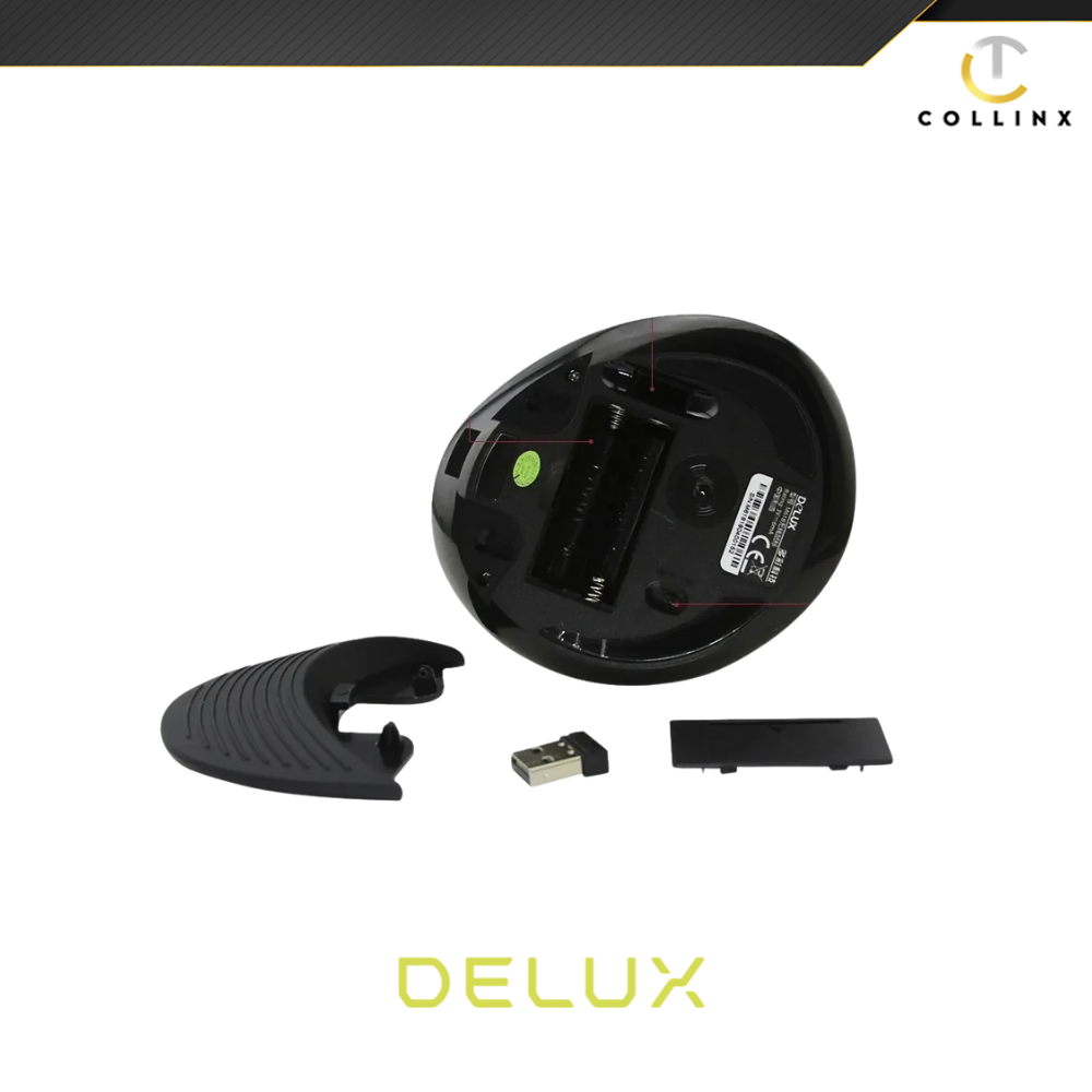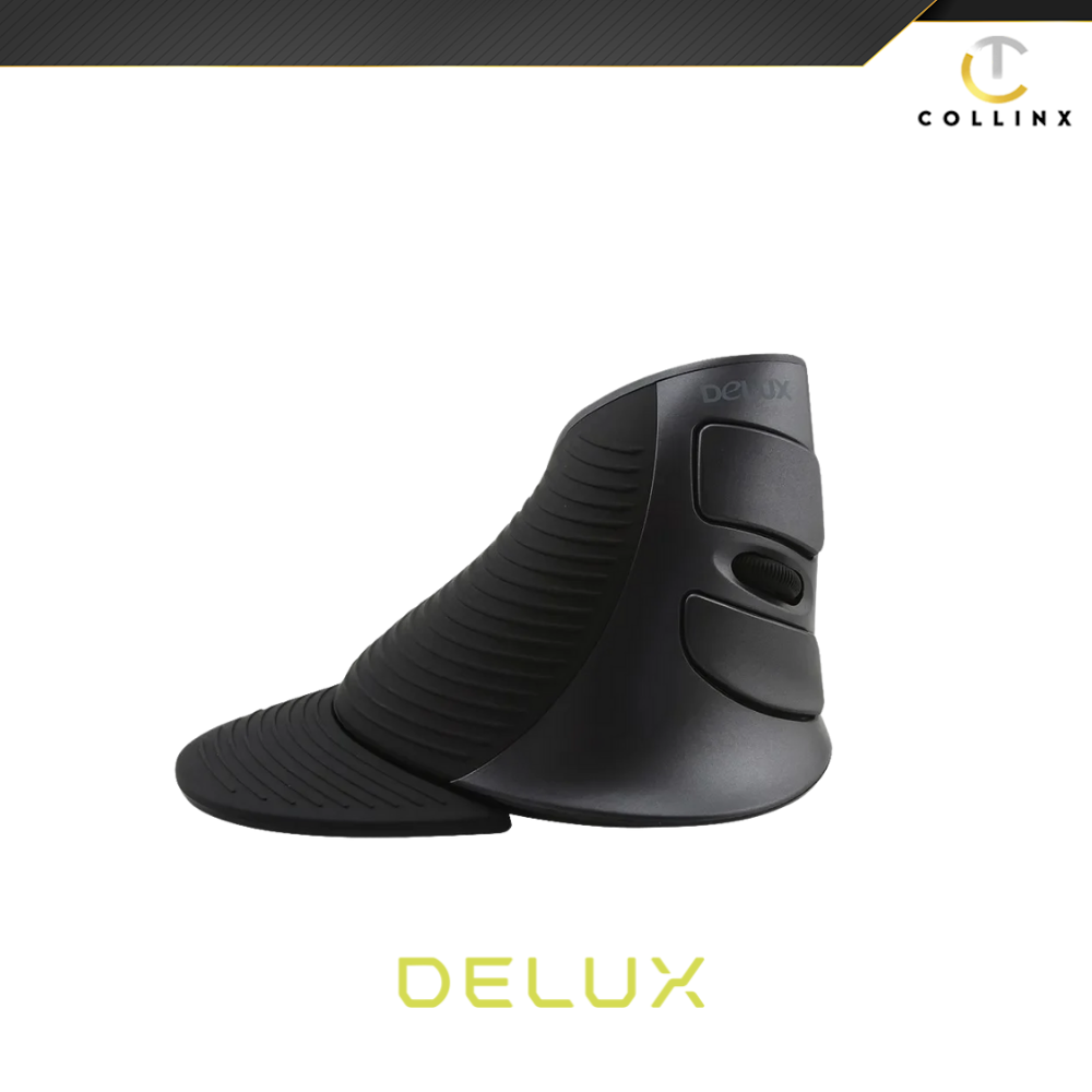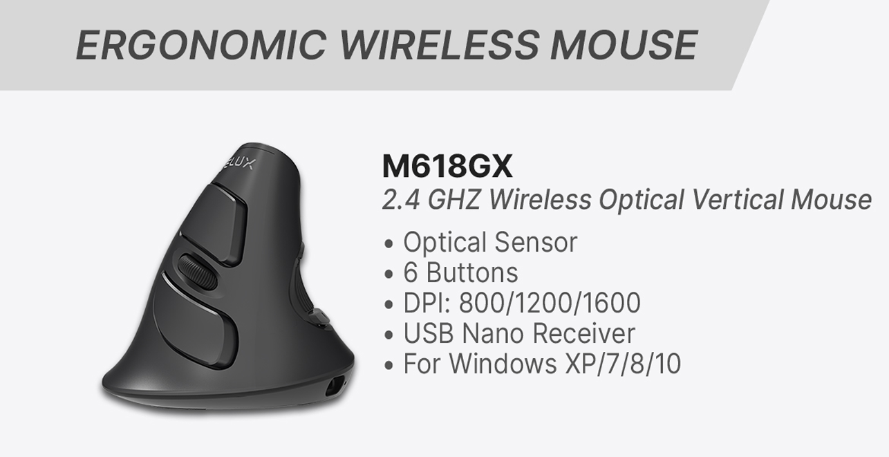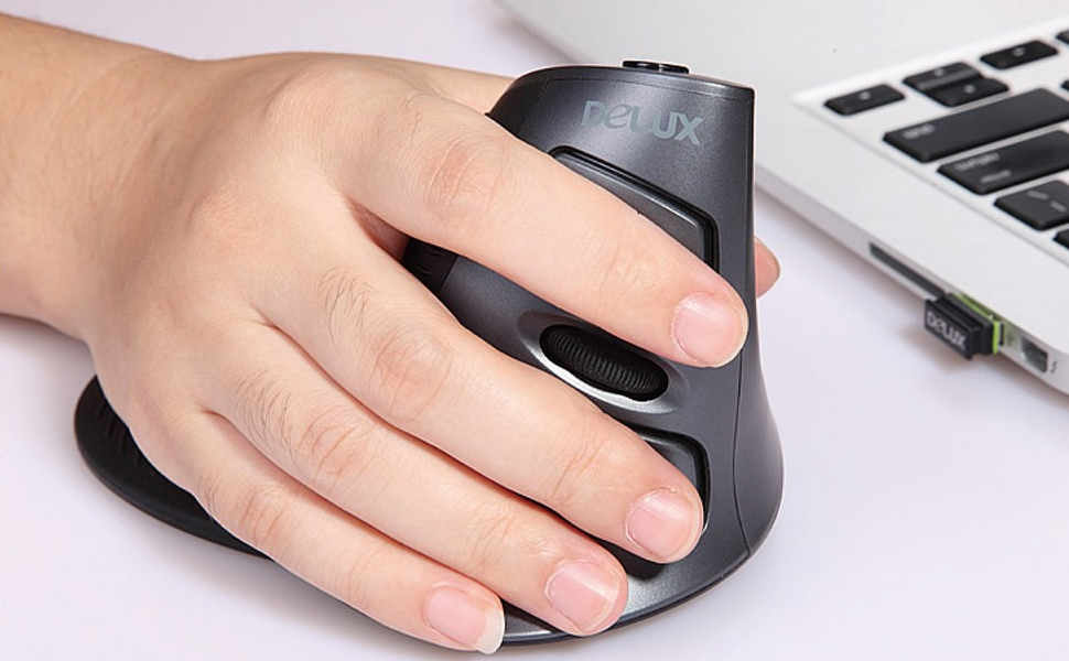 M618GX Ergo Vertical Mouse The Delux M618 wireless vertical mouse, adopts an ergonomic design, providing comfort for the user’s palm and wrist. The texture on the main body and palm rest has the function of antiskid. The mouse includes six function buttons.