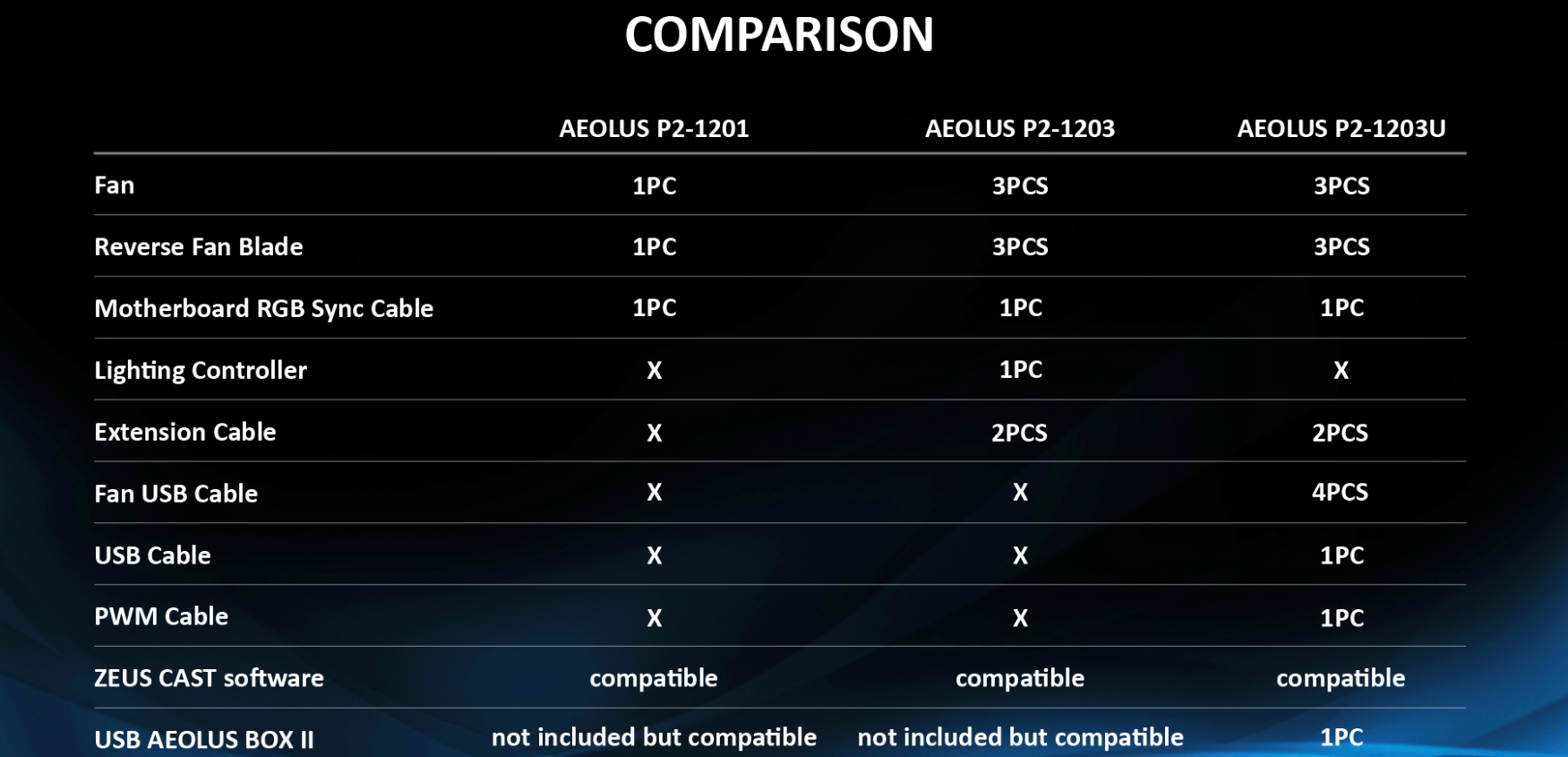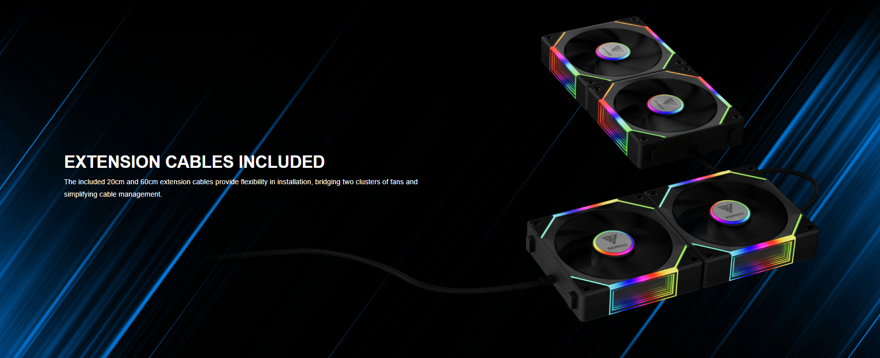 FanFan x 3 Reverse Fan Blade x 3 Extension Cable x 2 Motherboard Sync Cable x 1 Lubricant x 1 Lighting Controller x 1