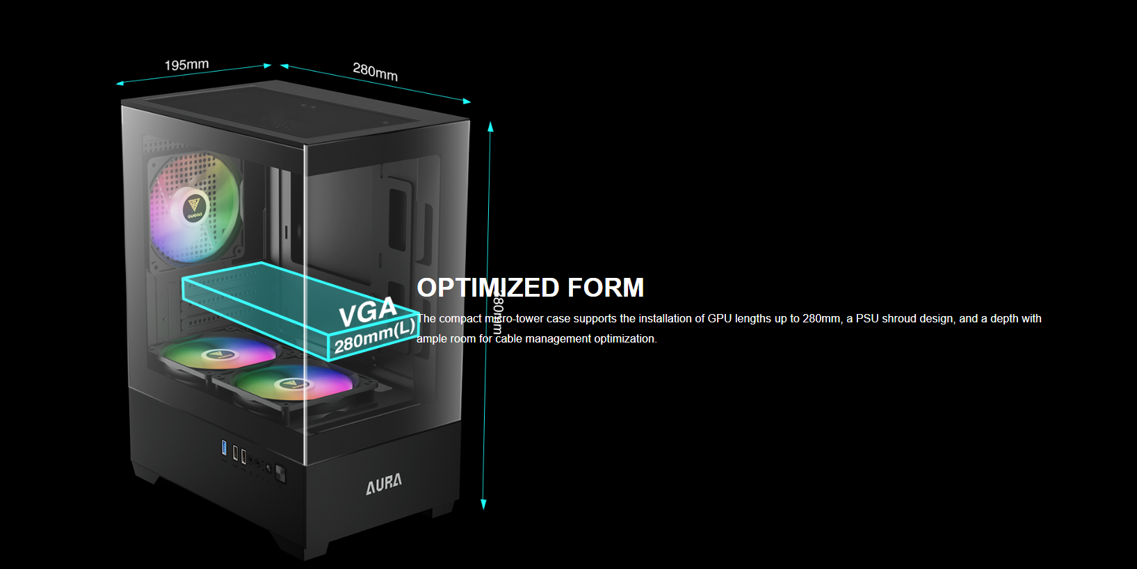 ClearanceCPU cooler height limitation: 155mm VGA length limitation: 280mm PSU length limitation: 150mm Top Liquid Cooler limitation : RAM height <31mm