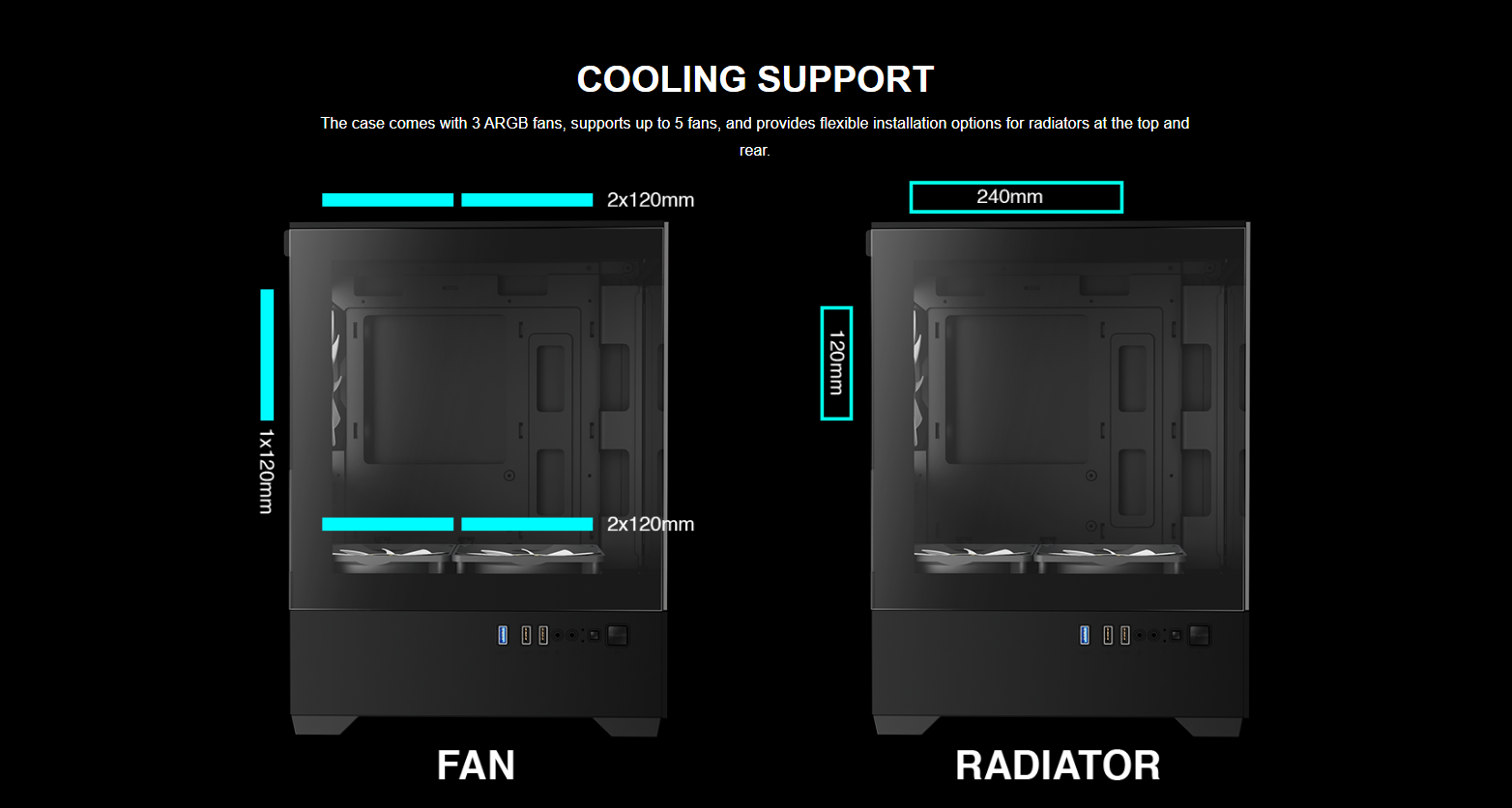Pre-installed FansBottom : 2 x 120mm ARGB Fan Rear: 1 x 120mm ARGB Fan