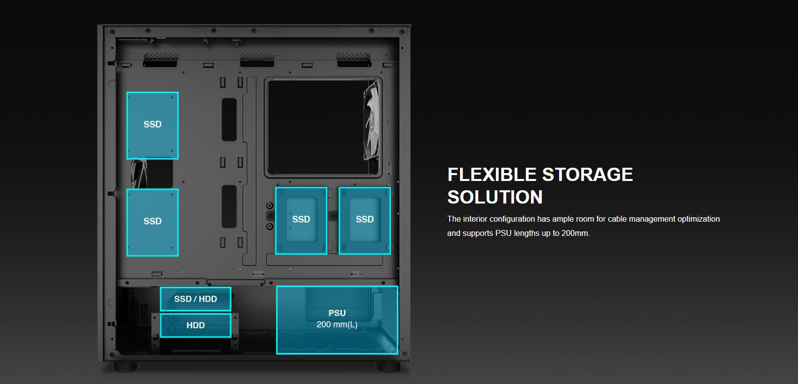 ClearanceCPU cooler height limitation: 180mm VGA length limitation: 390mm PSU length limitation: 200mm