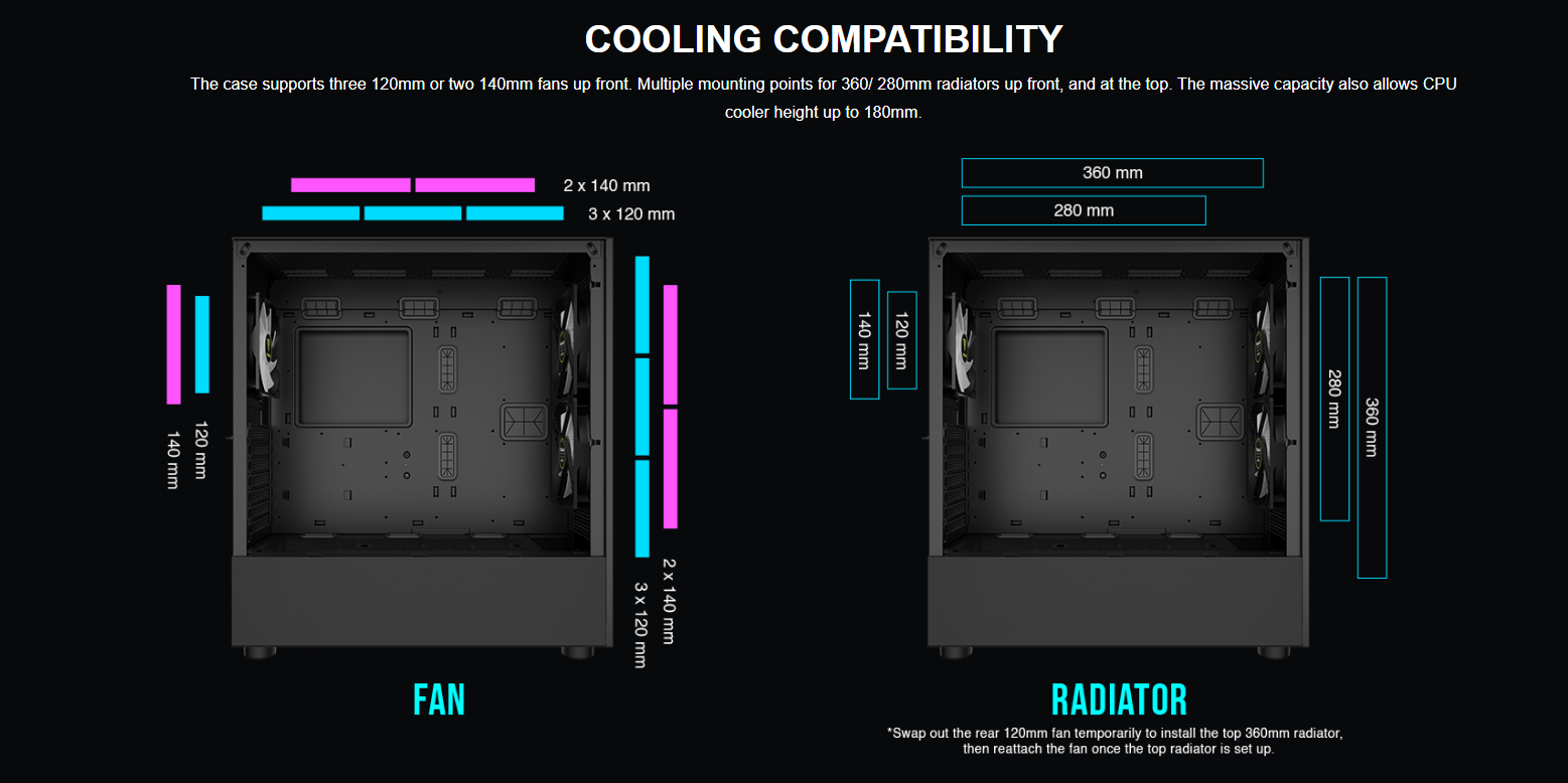 Fan SupportTop: 3 x 120mm、2 x 140mm / Front: 3 x 120mm 、2 x 140mm / Rear: 1 x 120mm、1 x140mm