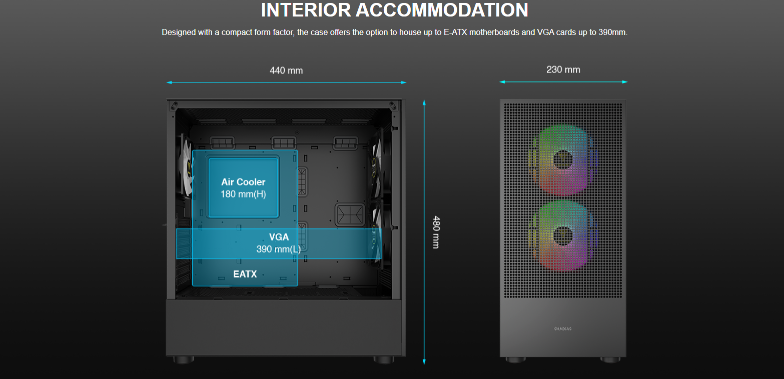ClearanceCPU cooler height limitation: 180mm VGA length limitation: 390mm PSU length limitation: 200mm