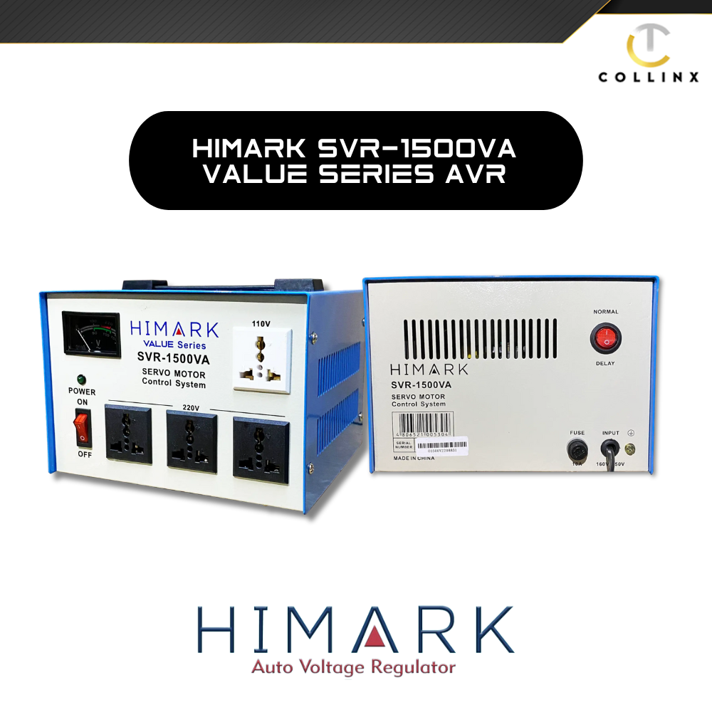 HIMARK SVR-1500VA VALUE SERIES AVR | Servo Motor Type Auto Voltage Regulator | 80% Power Factor resulting in 1200 Watts Maximum Load | 4 Universal Sockets – 1 x 110V AC Outlet, 3 x 220V AC Outlet | COLLINX COMPUTER