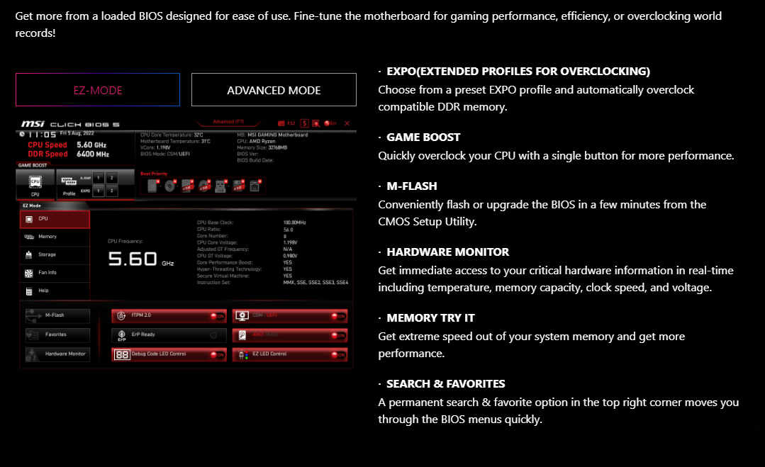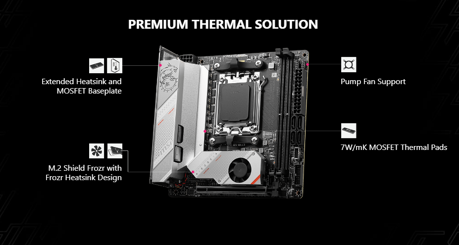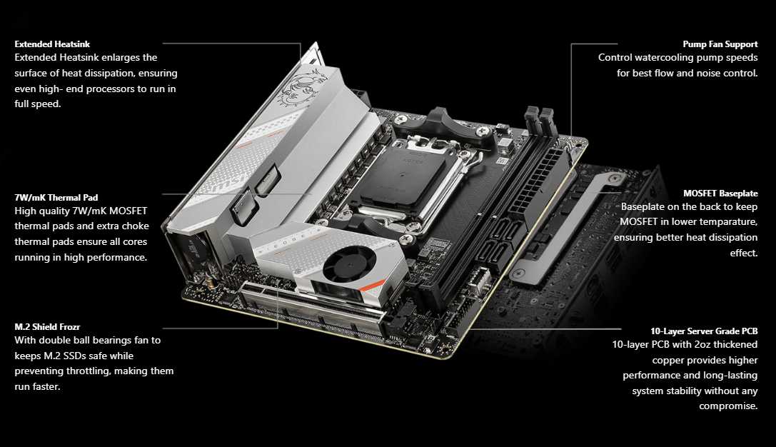 Premium Thermal Solution: Extended Heatsink, MOSFET thermal pads rated for 7W/mK, additional choke thermal pads and M.2 Shield Frozr are built for high performance system and non-stop gaming experience