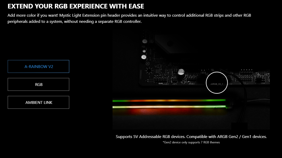 1x Power Connector(CPU_PWR) 1x CPU Fan 2x System Fan 2x Front Panel (JFP) 1x Chassis Intrusion (JCI) 1x Front Audio (JAUD) 1x Com Port (JCOM) 1x Addressable V2 RGB LED connector (JARGB_V2) 1x RGB LED connector(JRGB) 1x TPM pin header(Support TPM 2.0) 4x USB 2.0 ports 2x USB 5Gbps Type A ports
