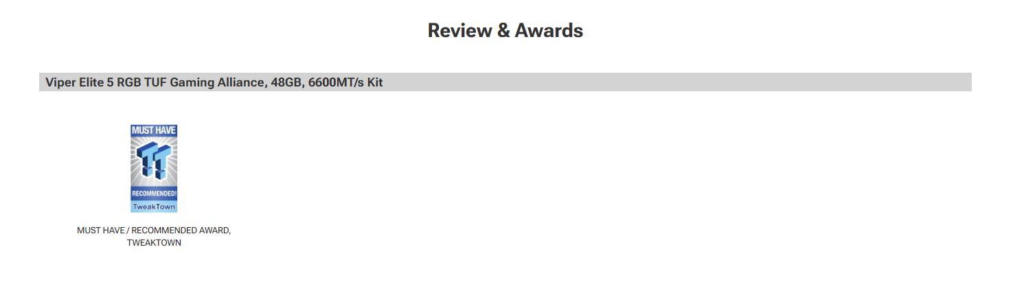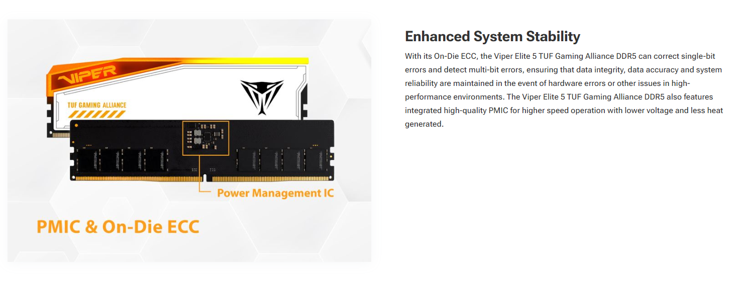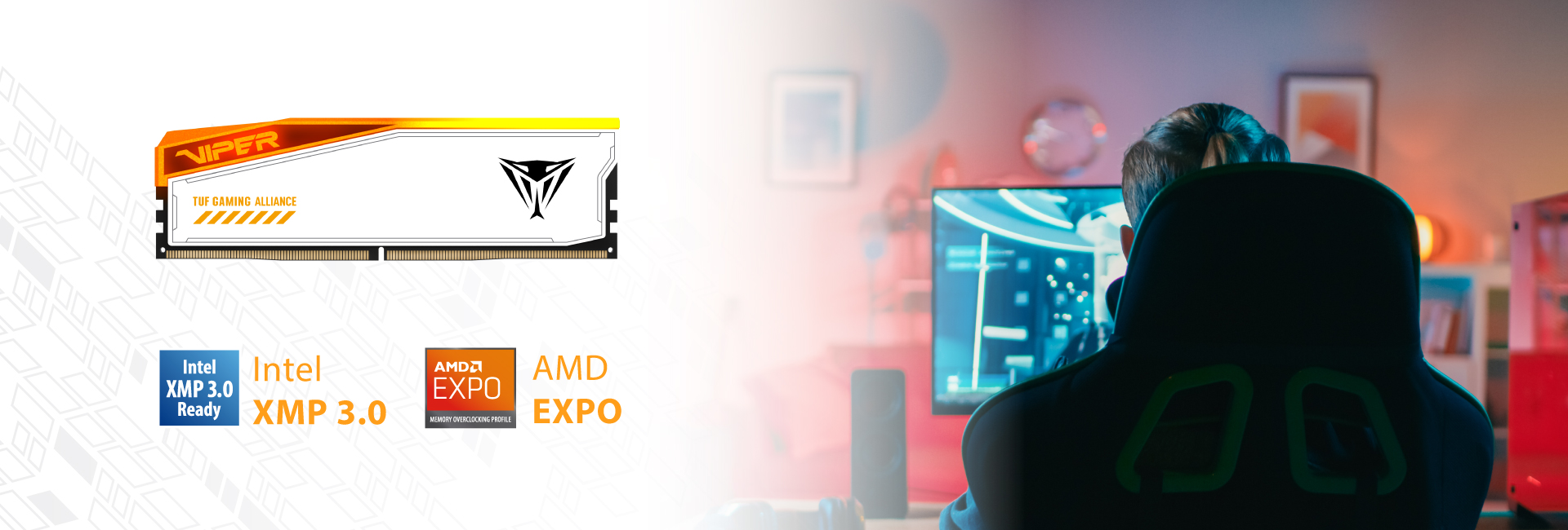 The Viper Elite 5 TUF Gaming Alliance DDR5 offers overclock support for Intel XMP 3.0 and AMD EXPO for select models.