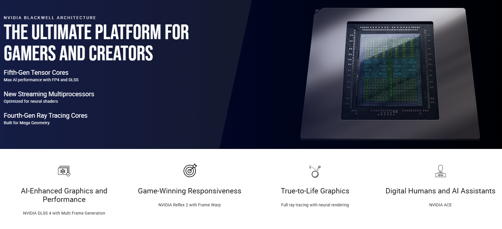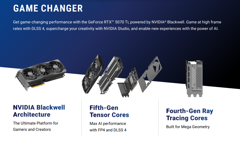Get game-changing performance with the GeForce RTX™ 5070 Ti, powered by NVIDIA® Blackwell. Game at high frame rates with DLSS 4, supercharge your creativity with NVIDIA Studio, and enable new experiences with the power of AI.