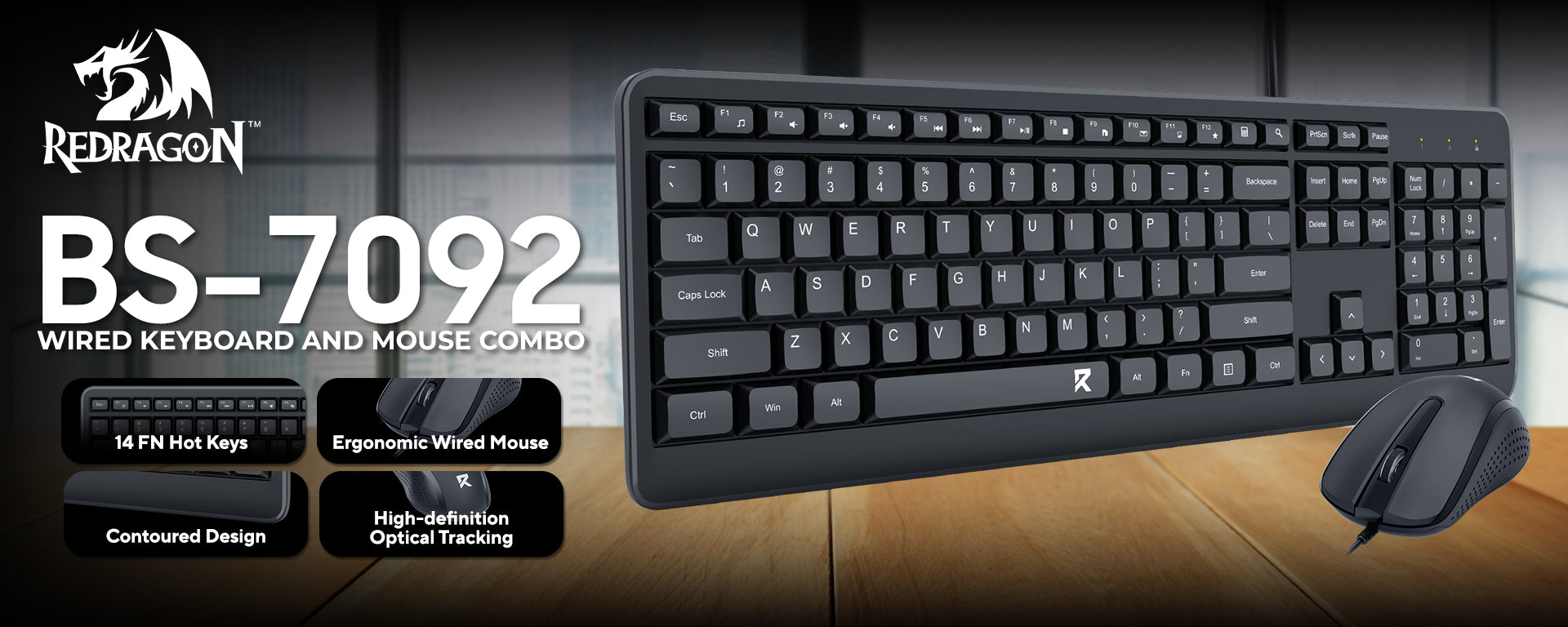 The Redragon BS-7092 Wired Keyboard and Mouse Combo is a reliable and comfortable solution for everyday computing. Designed with convenience in mind, the full-sized keyboard features 14 FN hotkeys, allowing quick access to frequently used programs and functions. Its anti-ghosting keys ensure smooth and accurate key presses, making typing effortless and efficient. The spill-resistant design adds durability, protecting the keyboard from accidental spills and extending its lifespan.