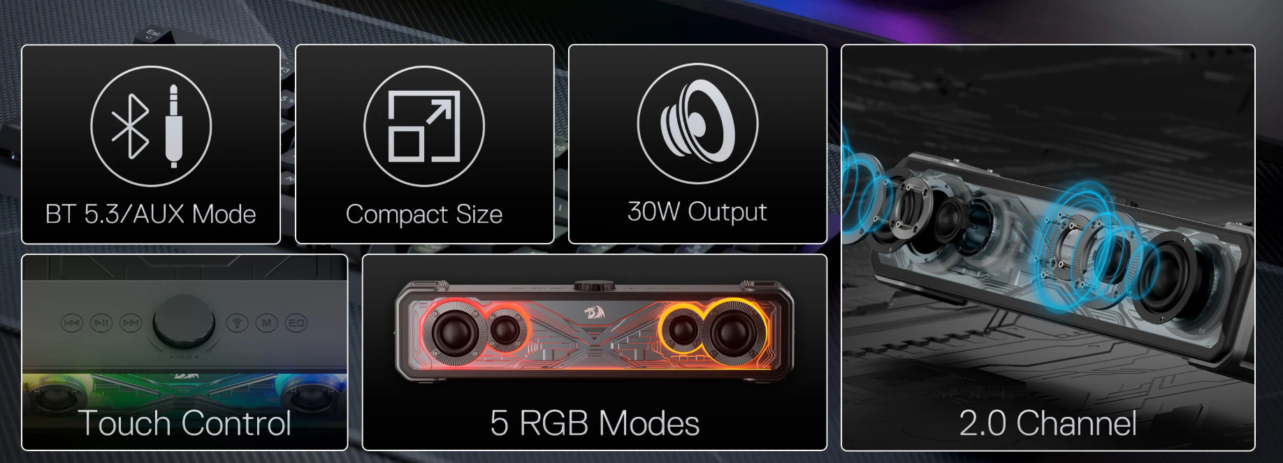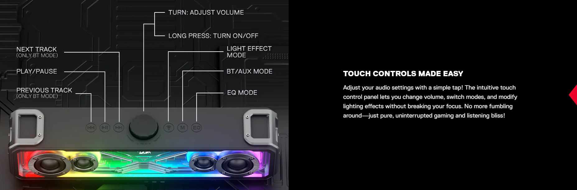 Tune it to Perfection The Redragon Bluetooth speaker provides three EQ modes (Music, Game, and Movie) to give you a sense of presence in different scenes, bringing you immersive game sound effects or a vivid concert listening experience with one click.