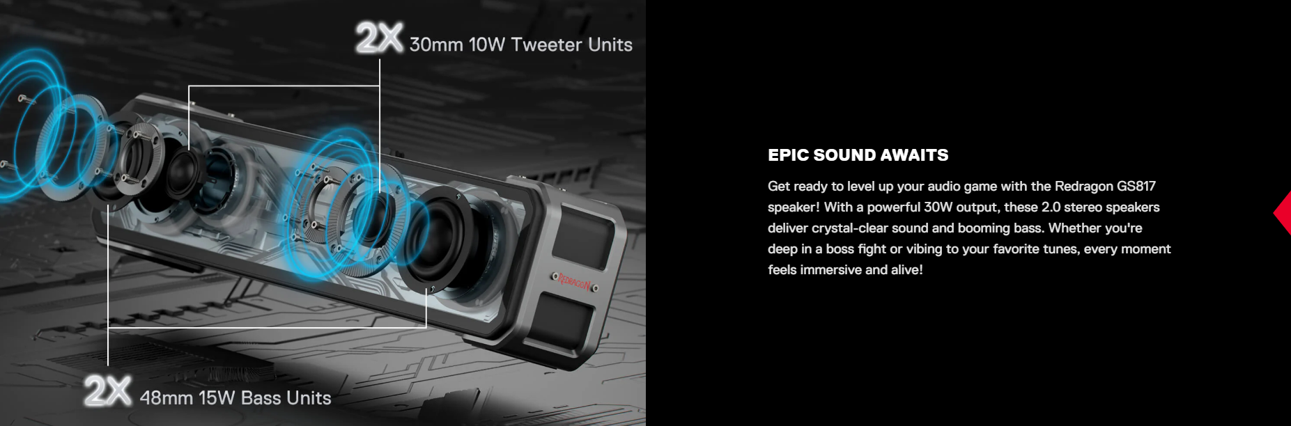 Epic Sound Awaits Get ready to level up your audio game with the Redragon GS817 speaker! With a powerful 30W output, these 2.0 stereo speakers deliver crystal-clear sound and booming bass. Whether you’re deep in a boss fight or vibing to your favorite tunes, every moment feels immersive and alive!