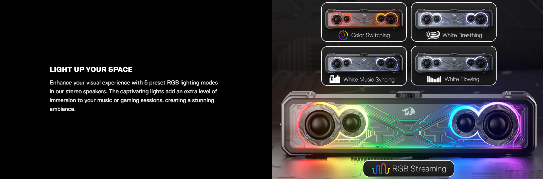 Light Up Your Space Enhance your visual experience with 5 preset RGB lighting modes in our stereo speakers. The captivating lights add an extra level of immersion to your music or gaming sessions, creating a stunning ambiance.