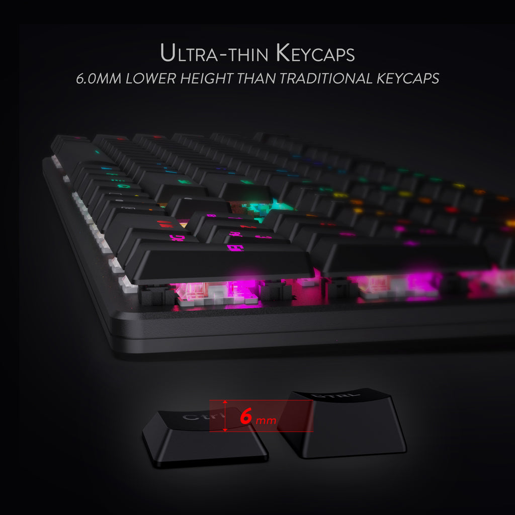 • 【Keep It Thin】The latest low profile design with a 30% lower key height provides the most precision you expect from original mechanical switches, enabling you to react faster to situations and enemies in games. 1.3mm mechanical OUTEMU switches reduce the travel distance and clicky noise while keeping the same signature durability and accuracy.