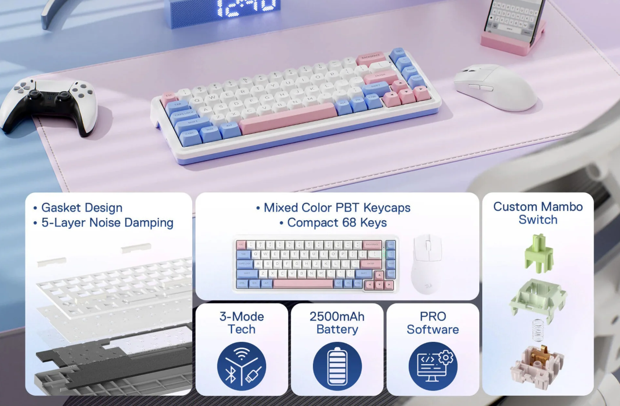 Redragon K709WBP RGB Nova Pro 81 Keys 75% Hot-Swappable Gasket-Mounted Wireless Mechanical Gaming Keyboard (Mint Mambo Switch) (Wonder Pink & Blue)