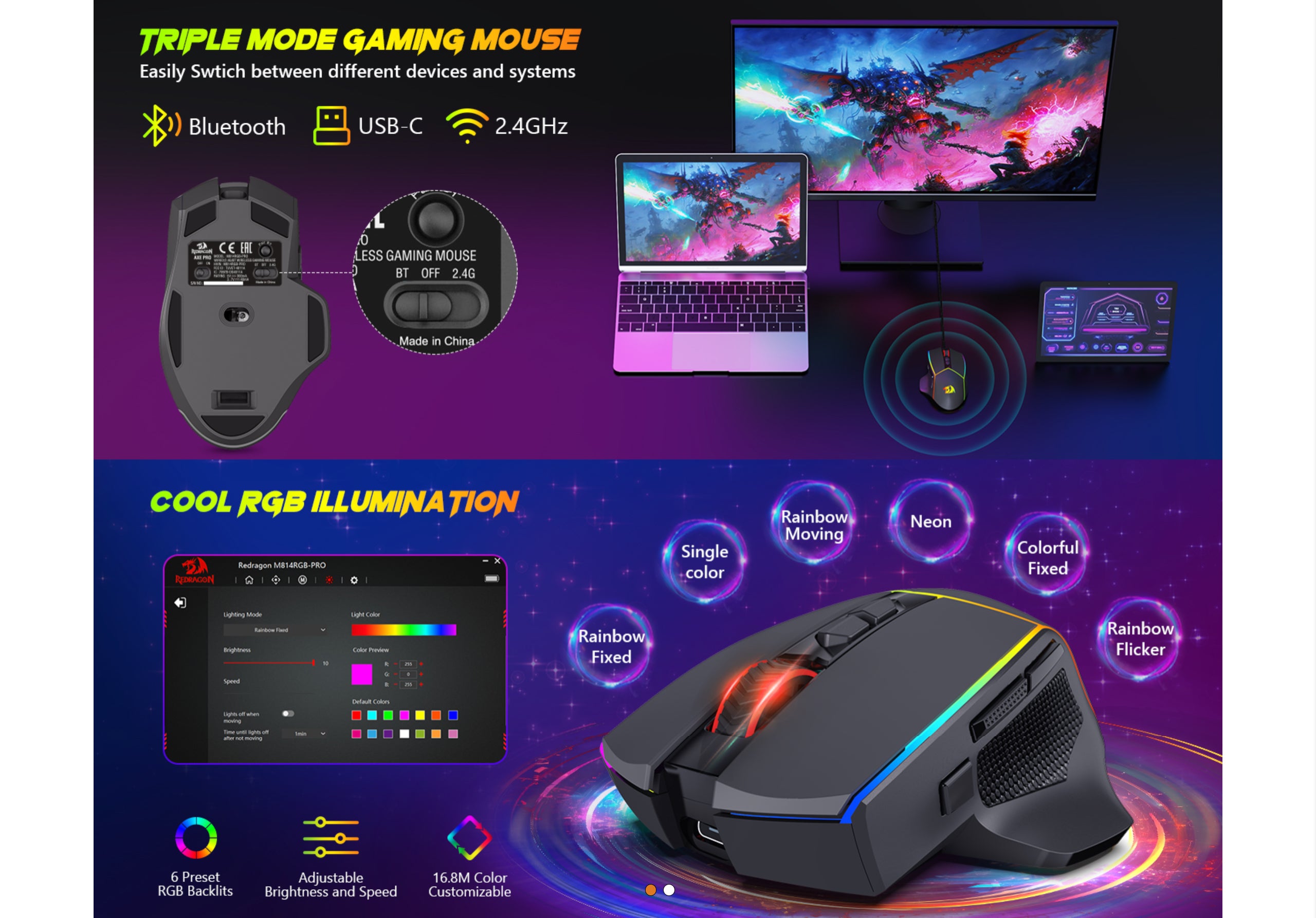 3 Modes Connectivity – M814 wireless gaming mouse adopts BT/2.4G/Wired connectivity, make it easy to switch between different devices or different systems, such as laptop, PC, IPad,tablet, Meeting different user needs for gaming or working.
