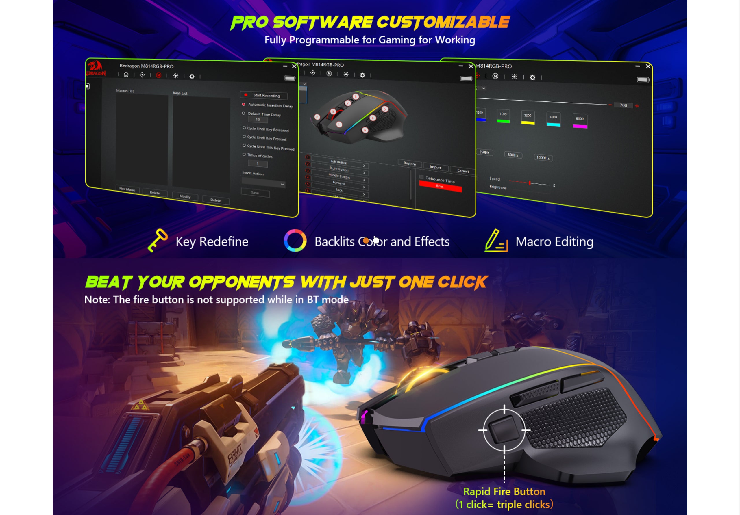 Fully Programmable Gaming Mouse – Redragon Wireless Gaming Mouse All buttons can be programmed with the driver and support macro editing. You can remap the buttons, assignment of complex macro functions, change RGB backlit effects, and adjust DPI (800-8000) to fit your different needs.