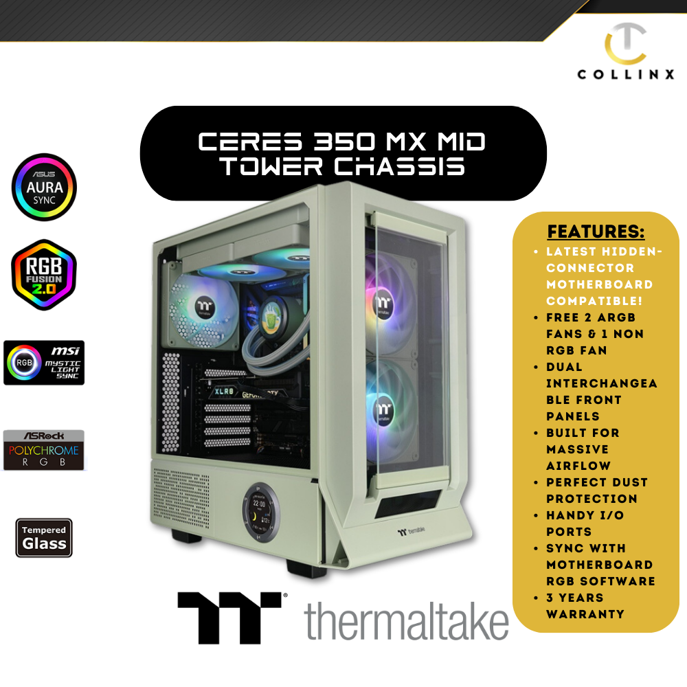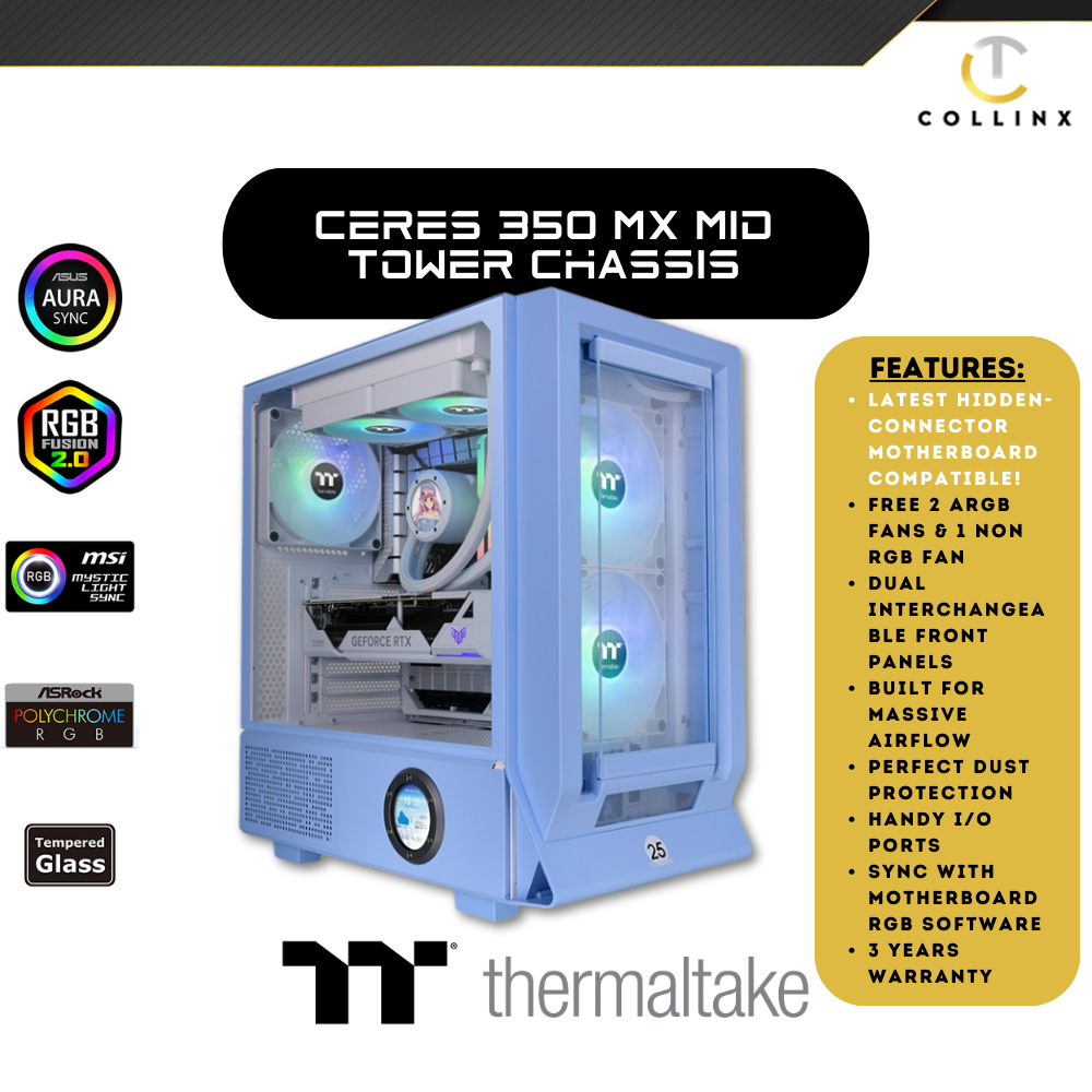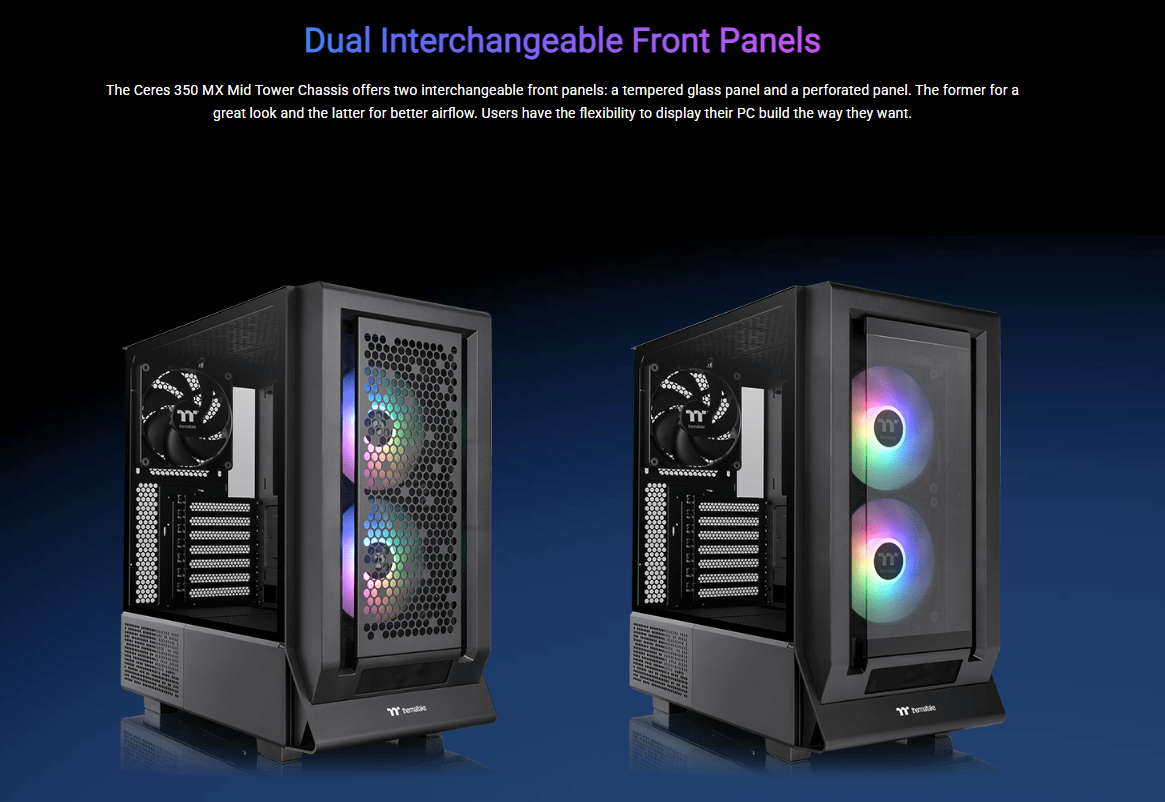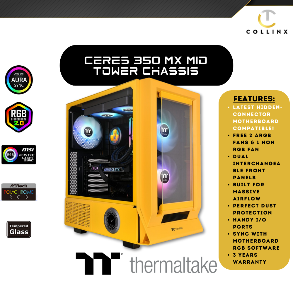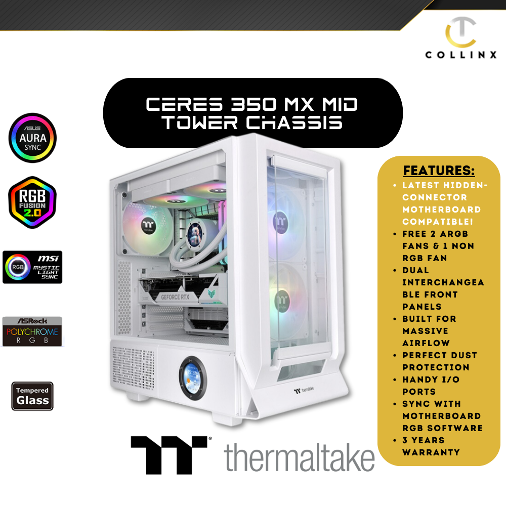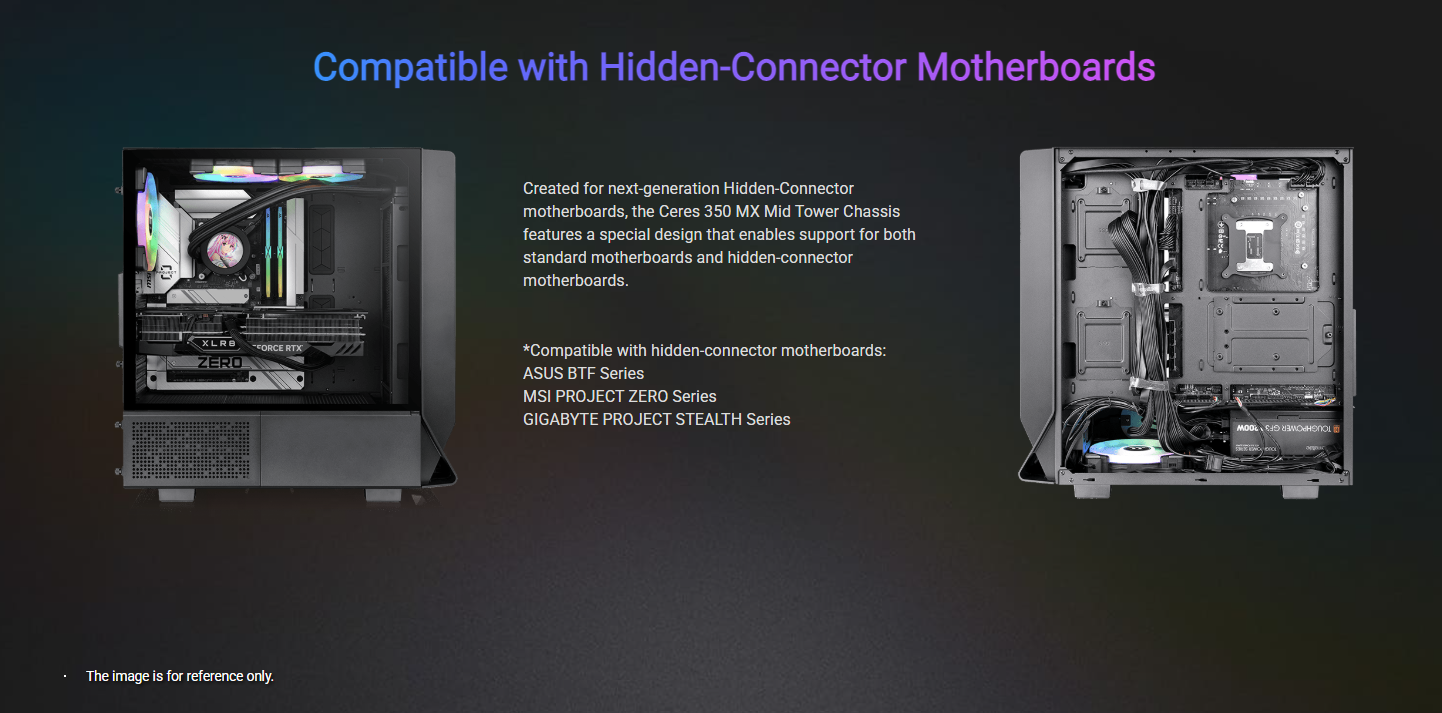 Ceres 350 MX Mid Tower Chassis is an ATX case that supports the latest Hidden-Connector motherboards (ASUS BTF series, MSI PROJECT ZERO series and GIGABYTE PROJECT STEALTH series) and comes with two interchangeable front panels. Featuring two CT140 ARGB Sync PC Cooling Fans at the front and one CT140 PC Cooling Fan at the rear, it supports up to a 360mm radiator at the front and a 280mm radiator on the top.